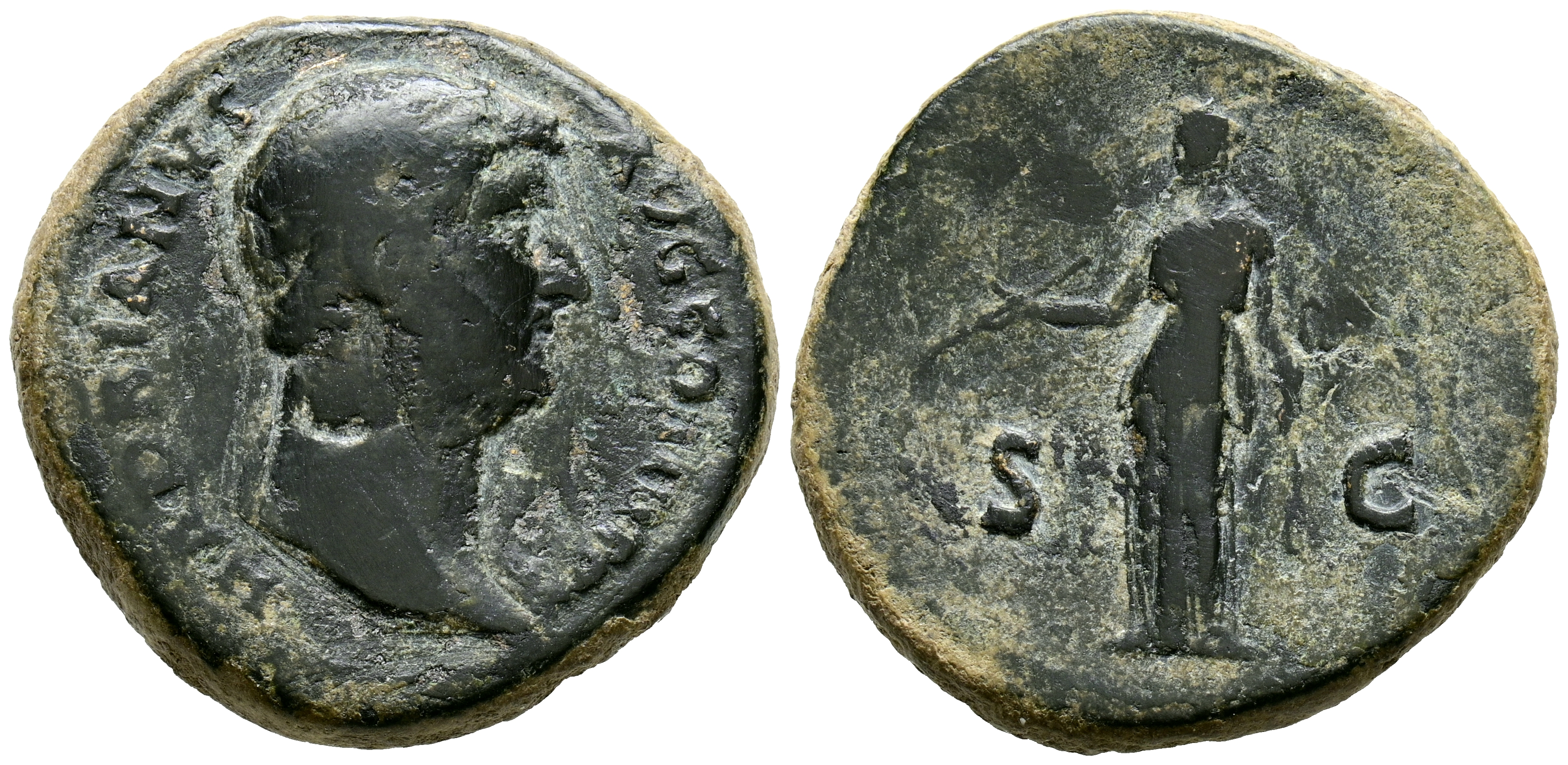 ADRIANO. As. (Ae. 12,89g/26mm). 137-138 d.C. (RIC 825). Anv: Cabeza de Adriano a derecha, alrededor leyenda: HADRIANVS AVG COS III P P. Rev: Diana estante a izquierda portando arco y flecha, entre: S-C. MBC.