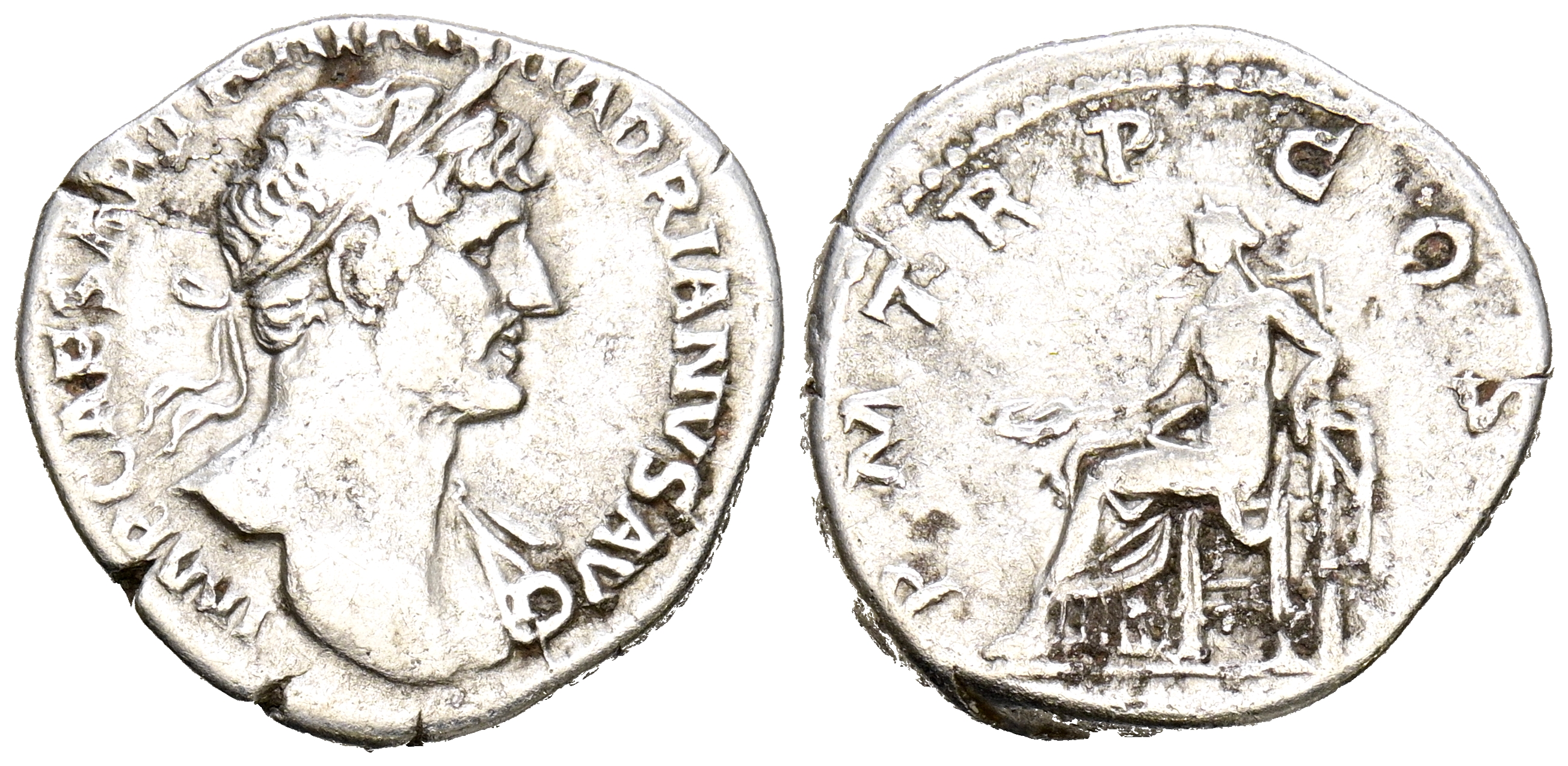 ADRIANO. Denario. (Ar. 3,23g/20mm). 119 d.C. Roma. (RIC 82). Anv: Busto laureado de Adriano a la derecha, con ligero drapeado en el hombro, alrededor leyenda: IMP CAESAR TRAIAN HADRIANVS AVG. Rev: Concordia sedente a la izquierda, portando pátera, alrededor leyenda: P M TR P COS II. MBC.