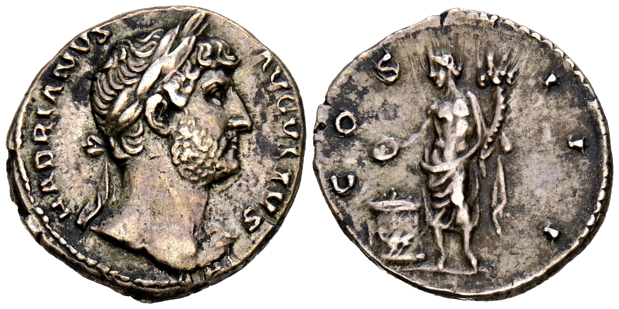 ADRIANO. Denario. (Ar. 3,43g/18mm). 119-123 d.C. Roma. (RIC 173). Anv: Cabeza laureada de Adriano a derecha, alrededor leyenda: HADRIANVS AVGVSTVS. Rev: genio estante a izquierda portando cornucopia y patera sobre altar encendido, alrededor leyenda: COS III. MBC+.