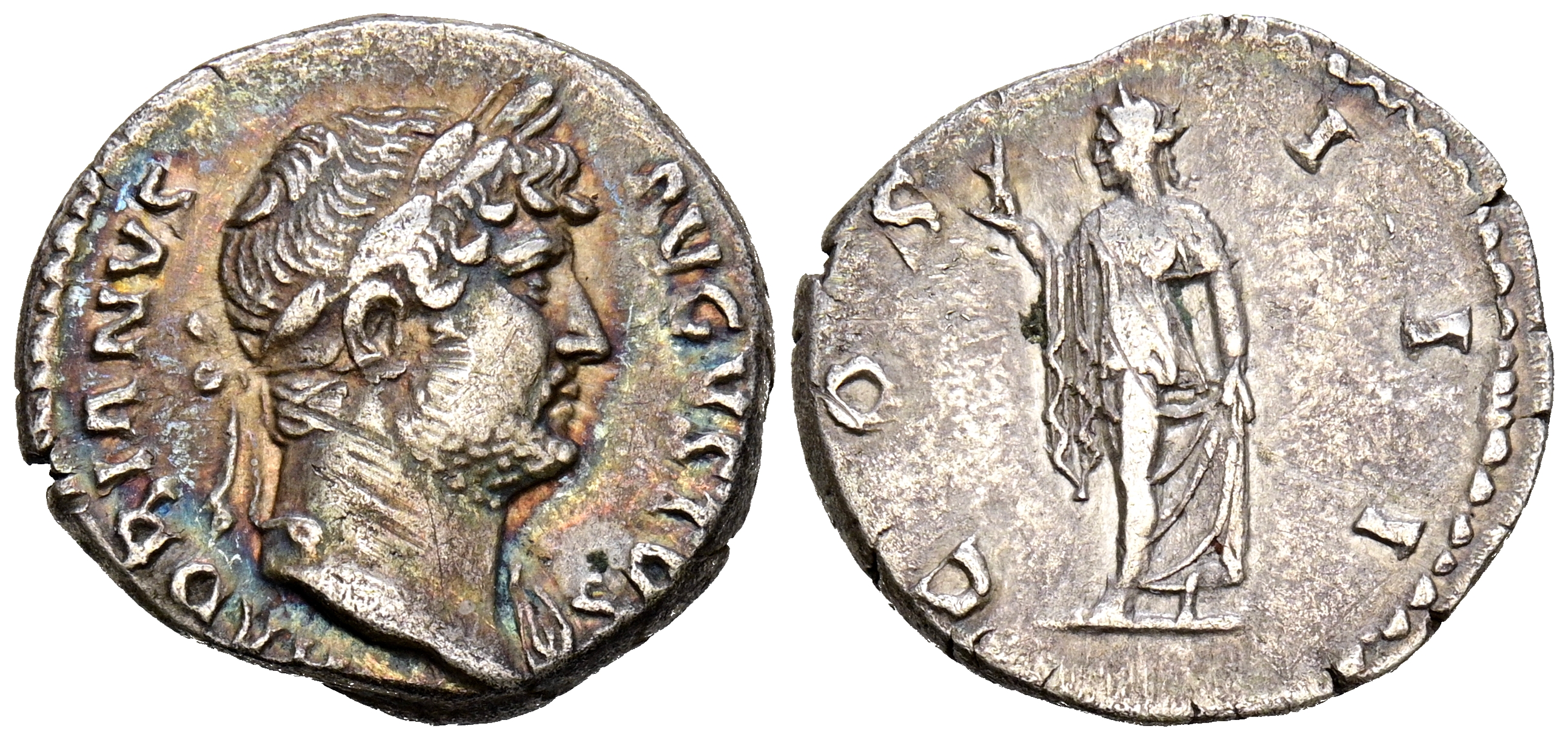 ADRIANO. Denario. (Ar. 3,10g/18mm). 125-128 D.C. Roma. (RIC 181). Anv: Cabeza laureada de Adriano a derecha, alrededor leyenda: HADRIANVS AVGVSTVS. Rev: Spes avanzando a izquierda portando flor, alrededor leyenda: COS III. MBC. Tono.