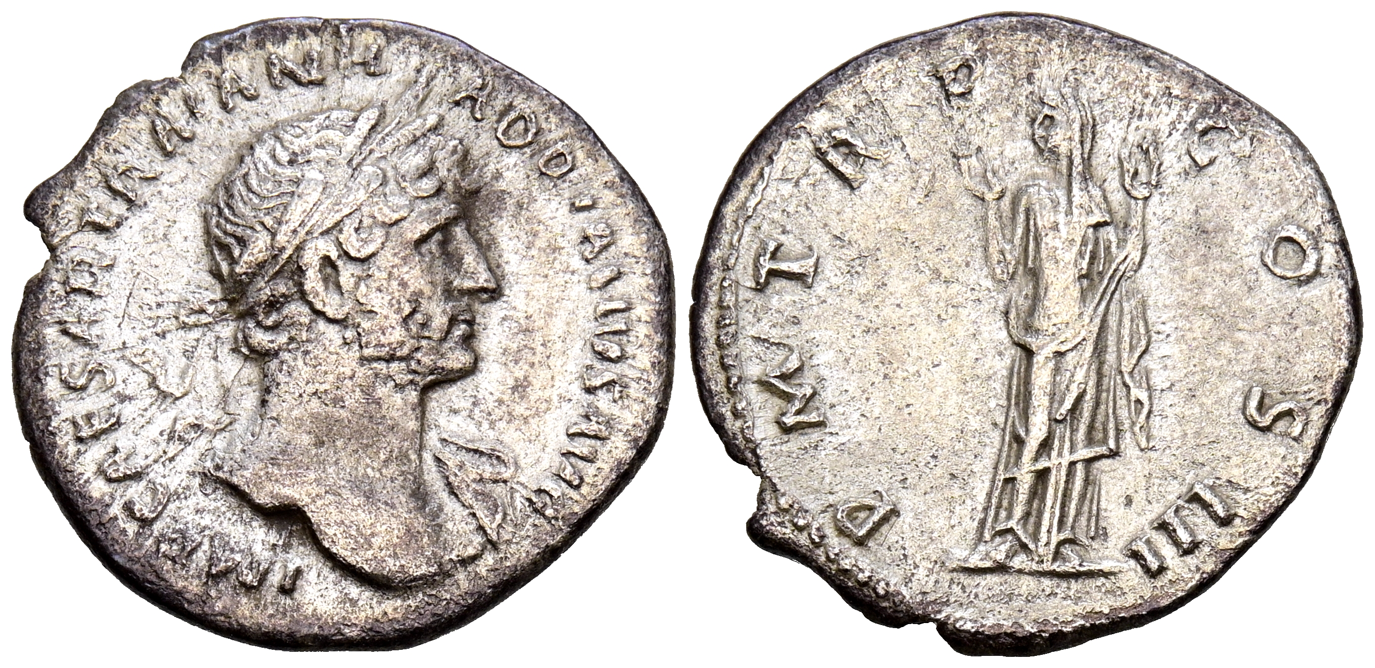 ADRIANO. Denario. (Ar. 2,39g/19mm). 119-125 d.C. Roma. (RIC 229). Anv: Busto laureado y con ligero drapeado al hombro de Adriano a derecha, alrededor leyenda: IMP CAESAR TRAIAN HADRIANVS AVG. Rev: Pietas estante y de frente alzando los brazos, alrededor leyenda: P M TR P COS III. MBC-.