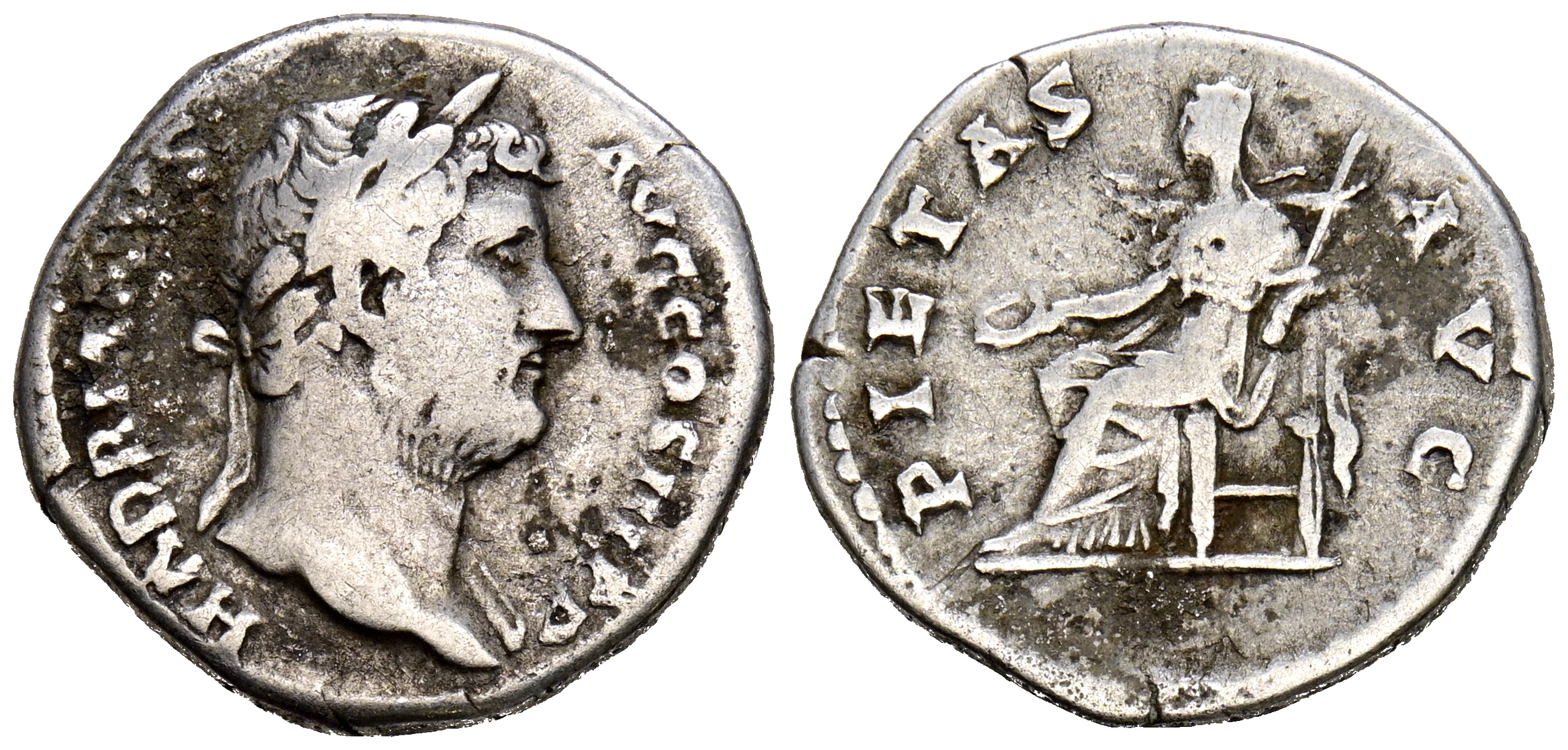ADRIANO. Denario. (Ar. 3,22g/18mm). 134-138 d.C. Roma. (RIC 260). Anv: Cabeza laureada de Adriano a derecha, alrededor leyenda: HADRIANVS AVG COS III P P. Rev: Pietas sentada a izquierda portando patera y cetro, alrededor leyenda: PIETAS AVG. MBC.