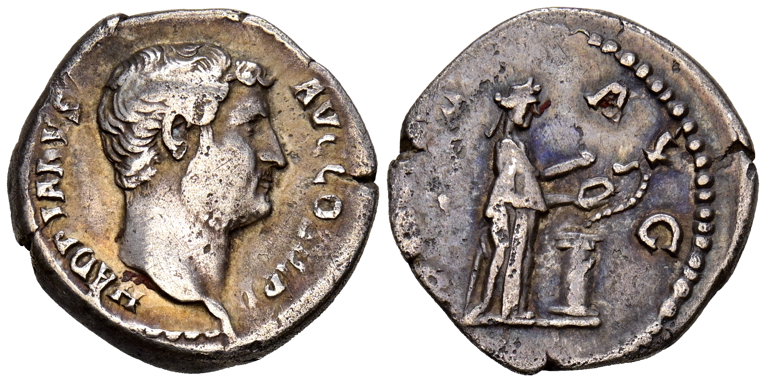 ADRIANO. Denario. (Ar. 3,21g/17mm). 133-135 d.C. Roma. (RIC 2048). Anv: Cabeza de Adriano a derecha, alrededor leyenda: HADRIANVS AVG COS III P P. Rev: Salus estante a derecha alimentando a serpiente sobre columna de patera, alrededor leyenda: SALVS AVG. MBC-.