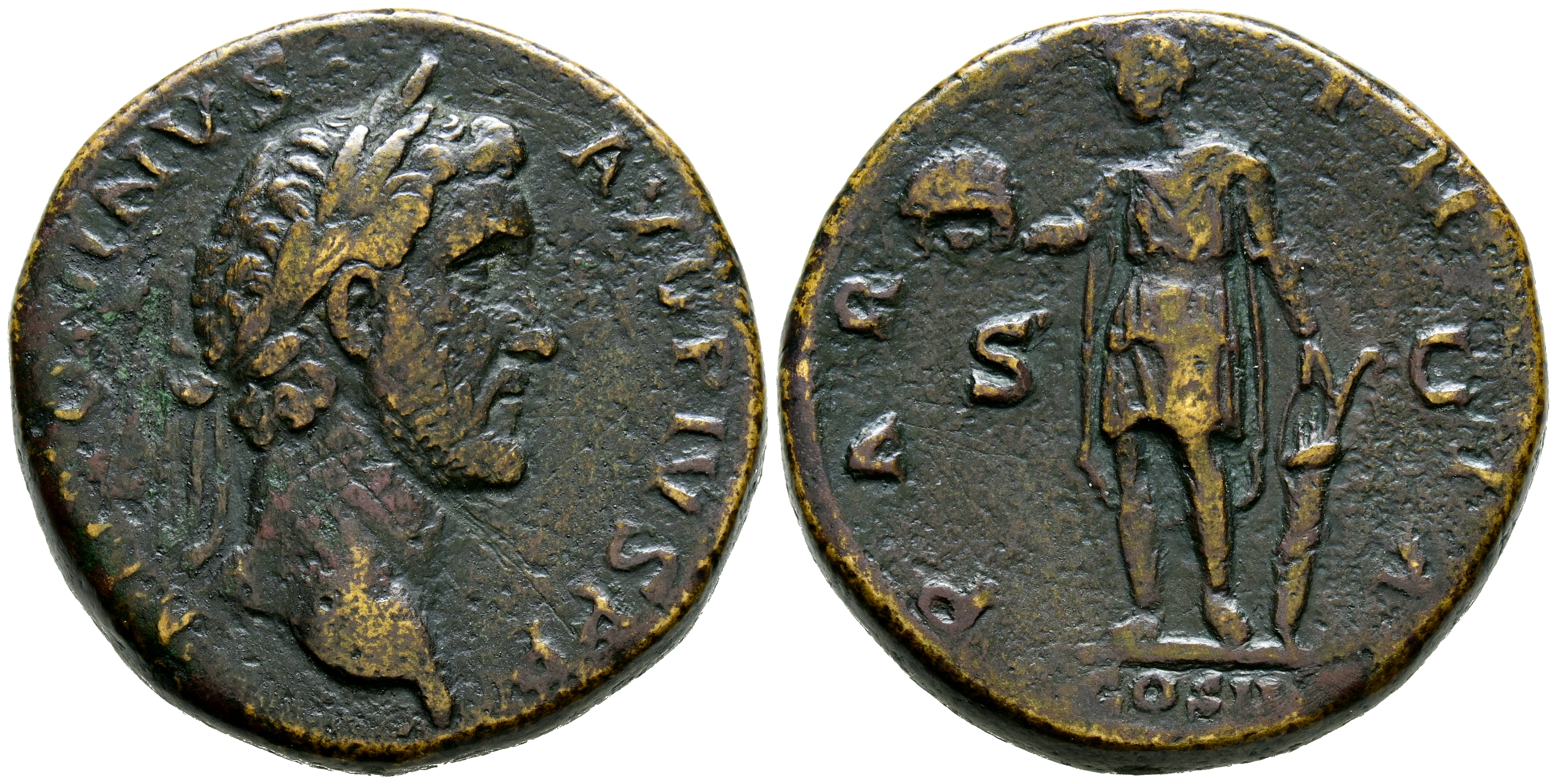 ANTONINO PIO. Sestercio. (Ae. 25,65g/32mm). 139 d.C. Roma. (RIC 586). Anv: Cabeza laureda de Antonino Pío a derecha, alrededor leyenda: ANTONINVS AVG PIVS PP. Rev: Partia estante a izquierda portando corona y cacaj, entre: S-C, en exergo: COS II, alrededor leyenda: PARTHIA. MBC. Rara.