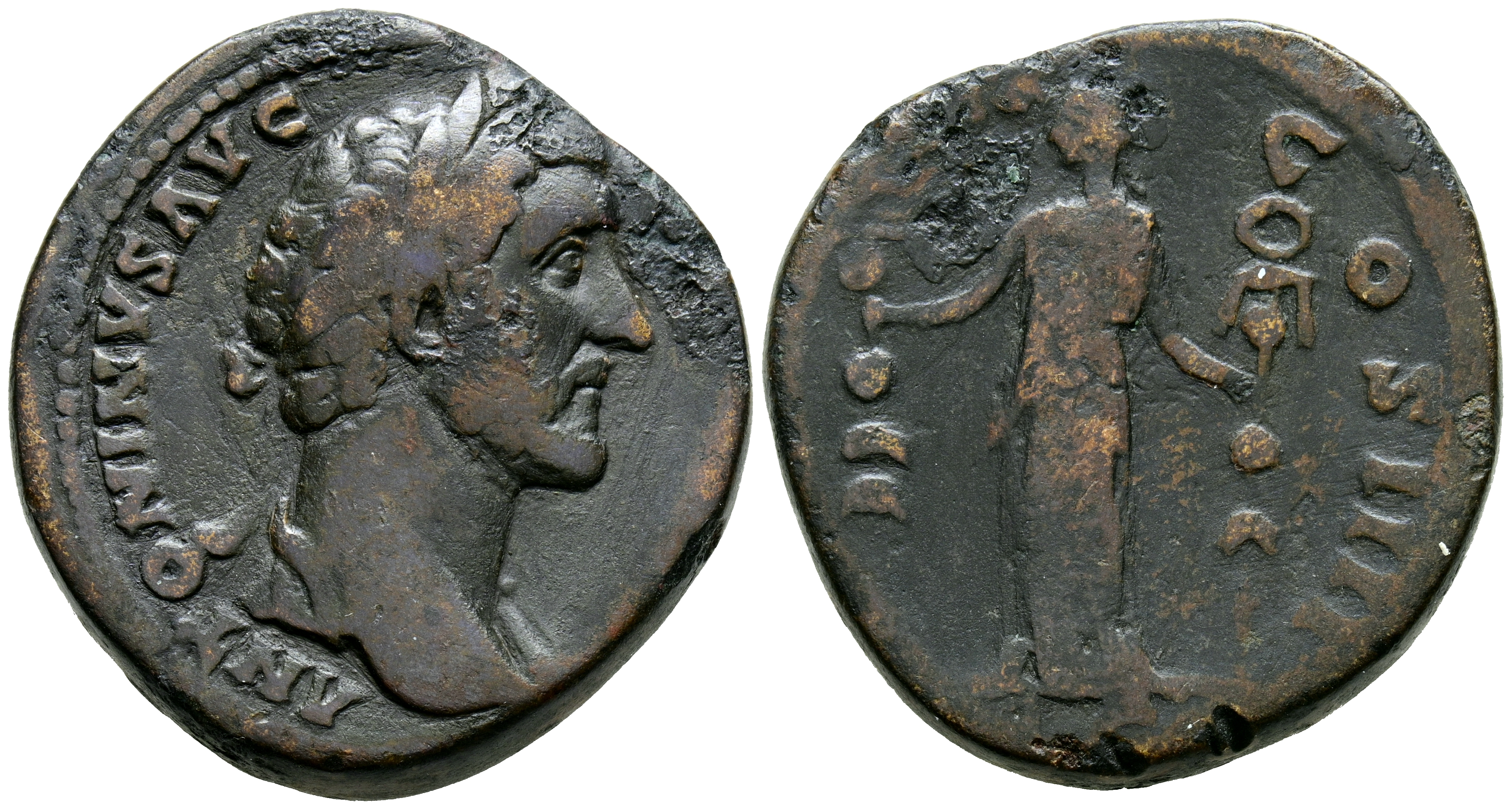 ANTONINO PIO. Sestercio. (Ae. 23,22g/32mm). 155-156 d.C. Roma. (RIC 943). Anv: Cabeza laureada de Antonino Pío a derecha, alrededor leyenda: ANOTNINVS AVG PIVS P P IMP II. Rev: Fides estante a derecha sosteniendo estandartes, entre: S-C, alrededor leyenda: TR POT XX COS IIII. BC+.