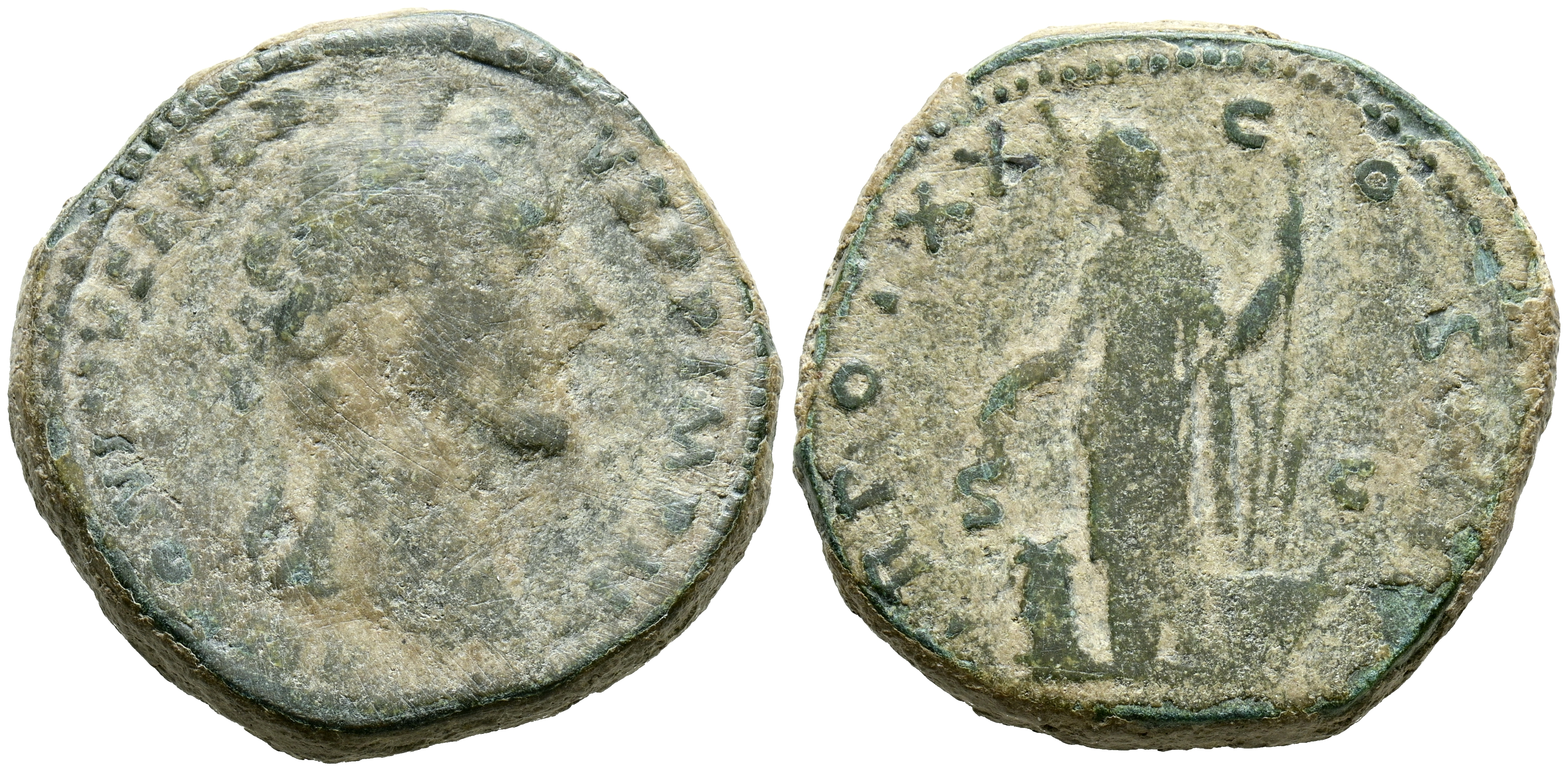 ANTONINO PIO. Sestercio. (Ae. 26,35g/33mm). 157-158 d.C. Roma. (RIC 981). Anv: Cabeza laureada de Antonino Pío a la derecha, alrededor leyenda: ANTONINVS AVG PIVS P P IMP II. Rev: Annona de pie, de frente, portando espigas sobre sobre modio y con timón, en la proa de un barco. BC+.