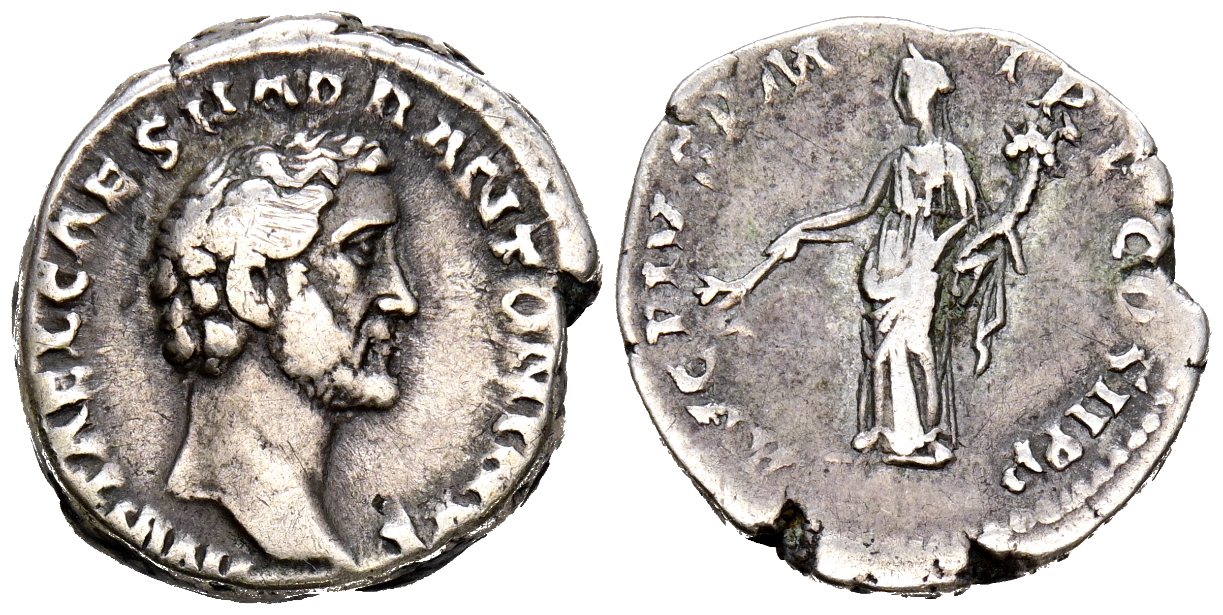 ANTONINO PIO. Denario. (Ar. 3,68g/17mm). 139 d.C. Roma. (RIC 35). Anv: Busto de Antonino Pío a derecha, alrededor leyenda: IMP CAE L CAES HADR ANTONI AVG. Rev: Pax estante a izquierda portando rama y cornucopia, alrededor leyenda: AVG PIVS P M TR P COS II P P. MBC.