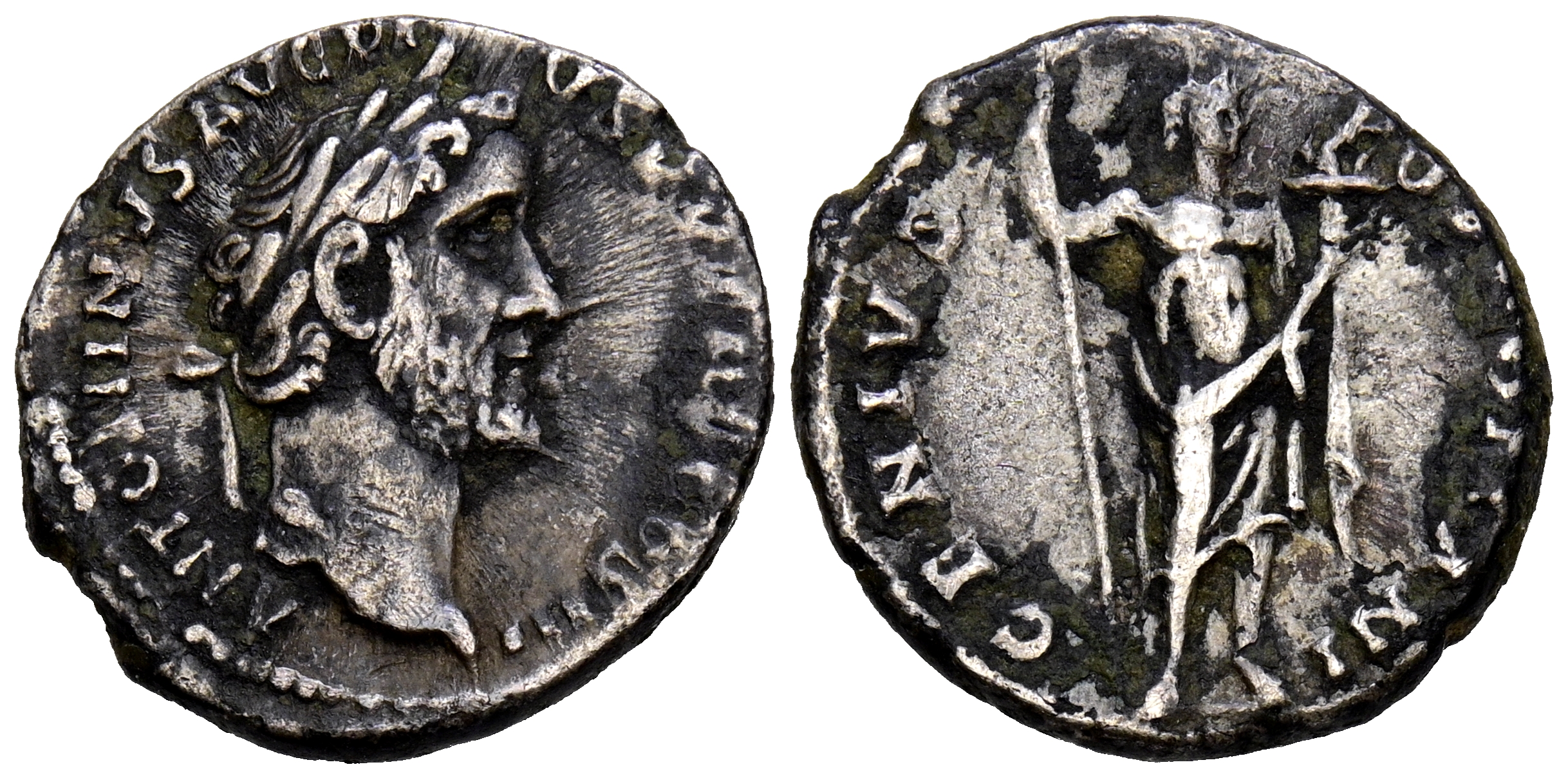 ANTONINO PIO. Denario. (Ar. 3,09g/17mm). 151-152 d.C. Roma. (RIC 70). Anv: Cabeza laureada de Antonino Pío a derecha, alrededor leyenda: ANTONINVS AVG PIVS P P TR P COS III. Rev: Genio estante a izquierda portando cetro y cornucopia, alrededor leyenda: GENIVS POP ROMANI. MBC.
