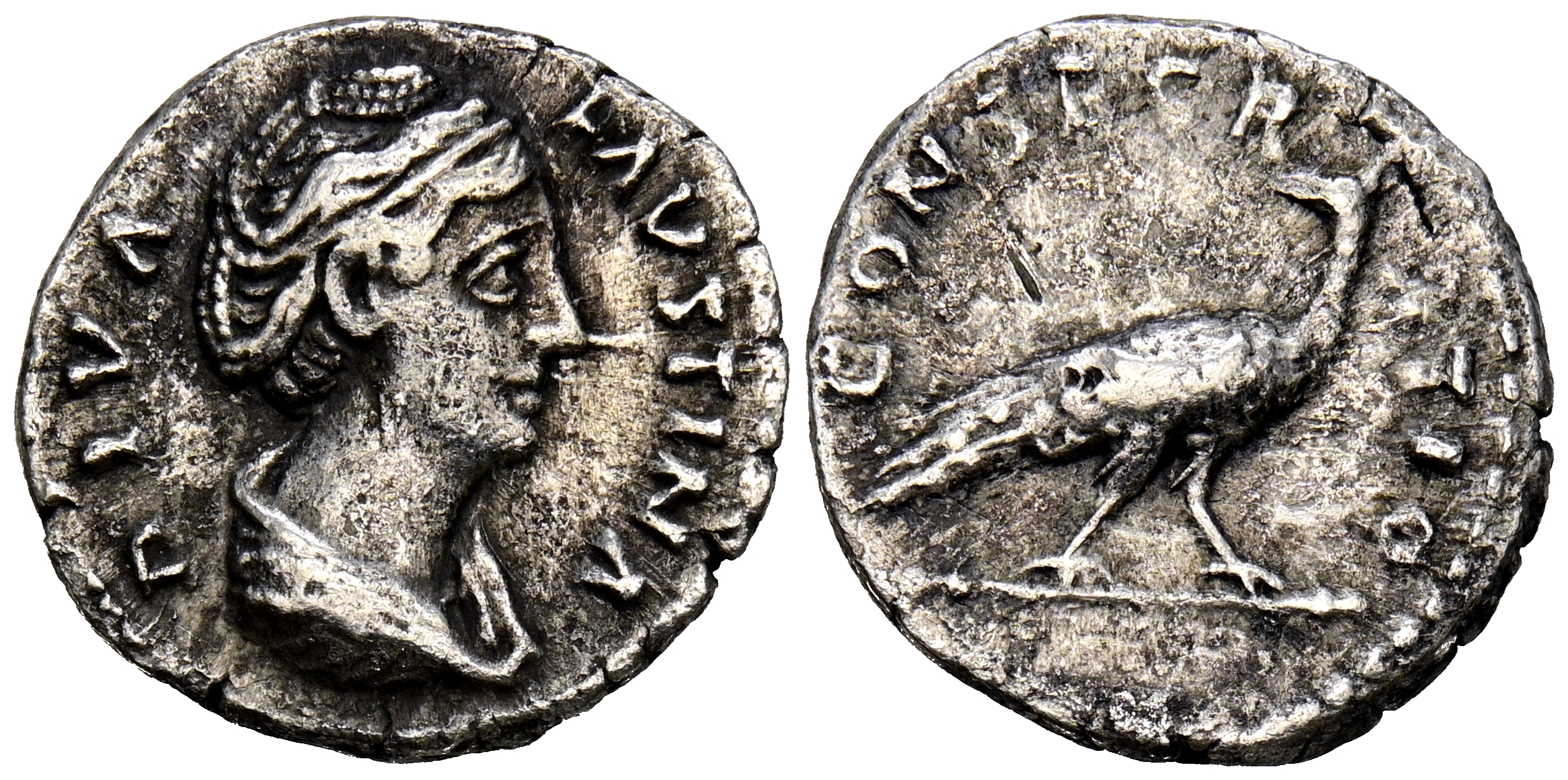 FAUSTINA I. Denario. (Ar. 3,01g/18mm). 141 d.C. Roma. (RIC 384). Anv: Busto diademado y drapeado de Faustina I a derecha, alrededor leyenda: DIVA FAVSTINA. Rev: Pavo real avanzado a derecha, alrededor leyenda: CONSECRATIO. MBC.