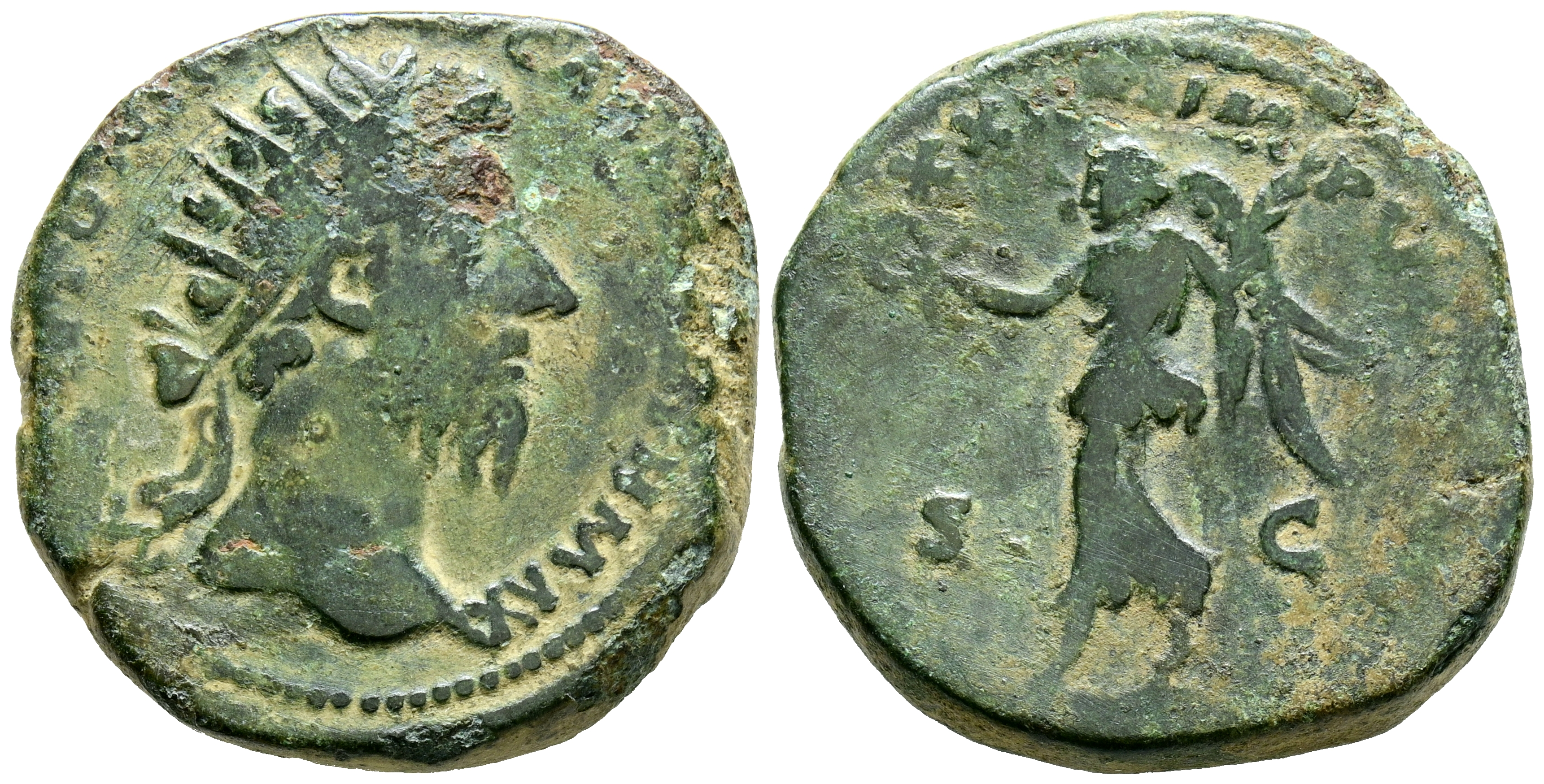MARCO AURELIO. Dupondio. (Ae. 12,22g/26mm). 168 d.C. Roma. (RIC 959). Anv: Cabeza radiada de Marco Aurelio a derecha, alrdedor leyenda: M ANTONINVS AVG ARM PARTH MAX. Rev: Victoria avanzando a izquierda portando patera y palma, entre: S-C, alrededor leyenda: TR POT XXII IMP V COS II. MBC-. Limpiado.