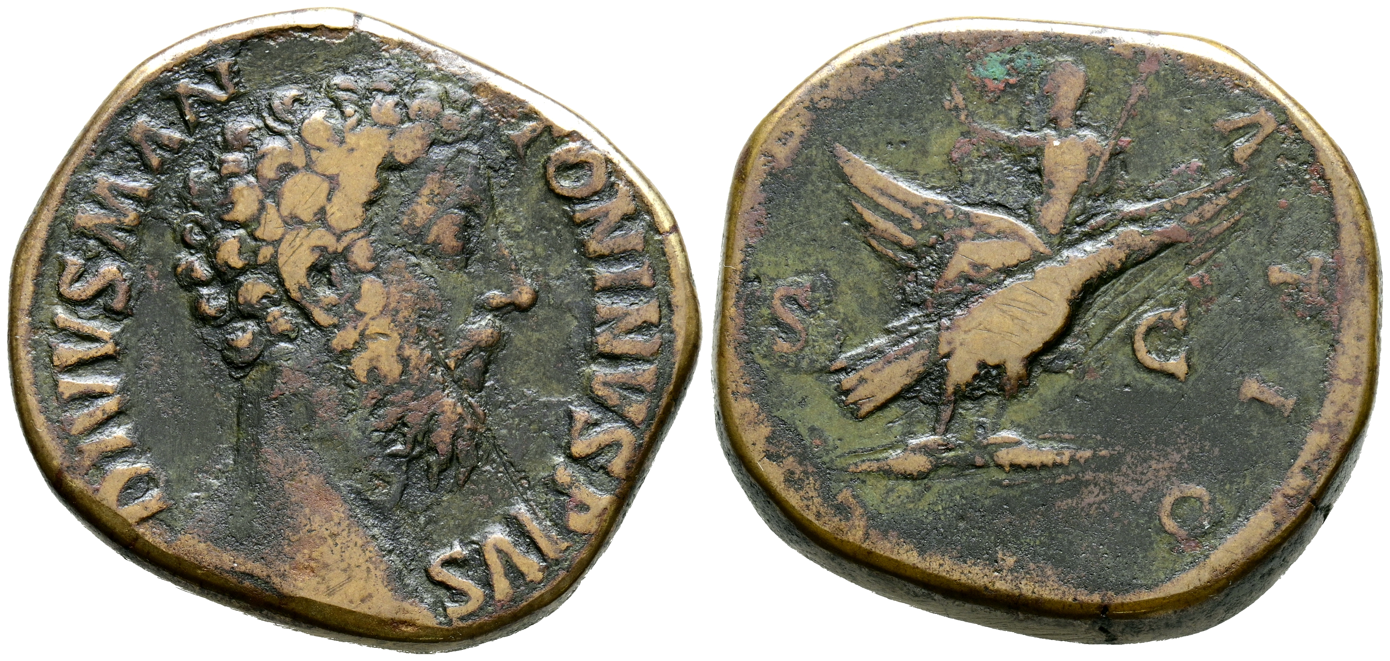 MARCO AURELIO. Sestercio. (Ae. g/mm). 180 d.C. Roma. (RIC 660). Anv: Cabeza desnuda de Marco Aurelio a la derecha, alrededor leyenda: DIVVS M ANTONINVS PIVS. Rev: Marco Aurelio portando cetro y declinado sobre águila estante a la derecha con rayos entre las patas, en campo: S-C, alrededor leyenda: CONSECRATIO. MBC-.