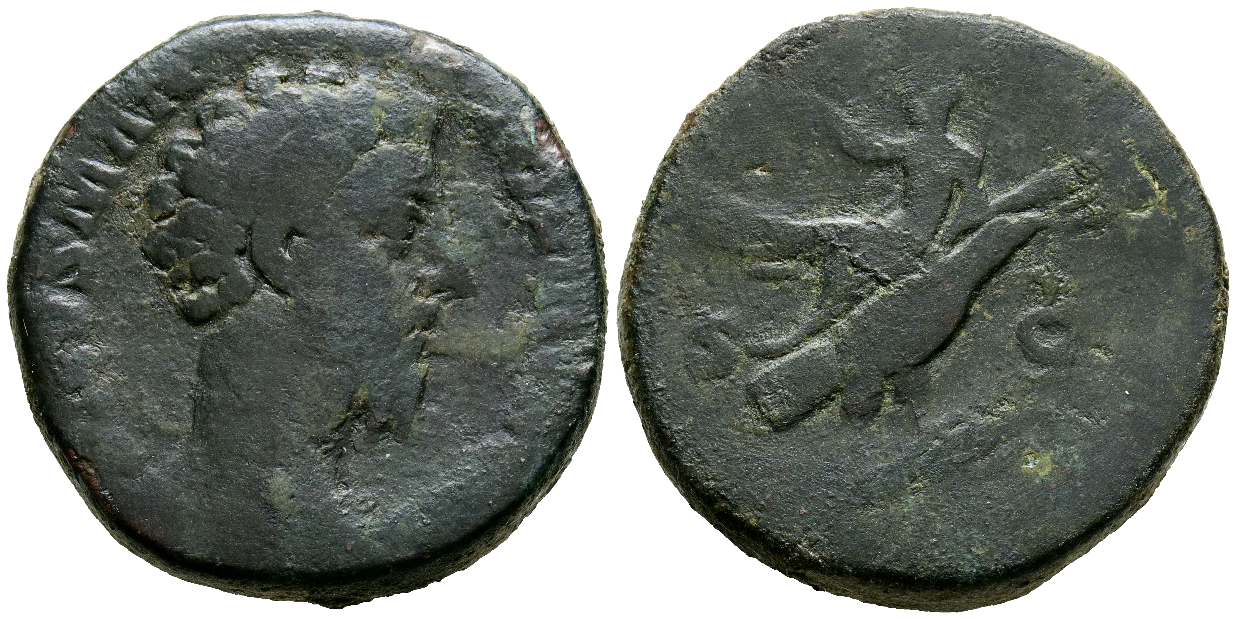 MARCO AURELIO. Sestercio. (Ae. 21,00g/29mm). 180 d.C. Roma. (RIC 660). Anv: Cabeza desnuda de Marco Aurelio a la derecha, alrededor leyenda: DIVVS M ANTONINVS PIVS. Rev: Marco Aurelio sosteniendo cetro y sentado sobre espalda de águila, en pie a la derecha sobre rayos, en campo: S-C, alrededor leyenda: CONSECRATIO. BC+. Escasa.