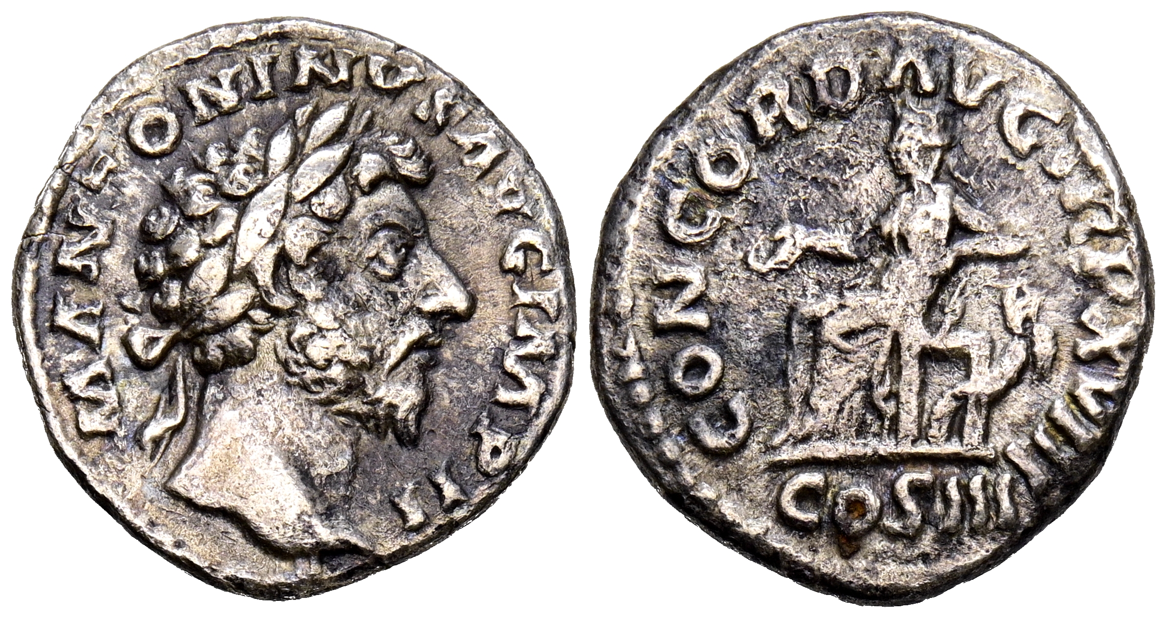 MARCO AURELIO. Denario. (Ar. 2,77g/17mm). 162-163 d.C. Roma. (RIC 59). Anv: Cabeza de Marco Aurelio a derecha, alrededor leyenda: IMP M ANTONINVS AVG. Rev: Concordia sentada a izquierda portando patera con el hombro sobre estatua de Spes, en exergo: COS III, alrededor leyenda: CONCORD AVG TR P XVII. MBC-.