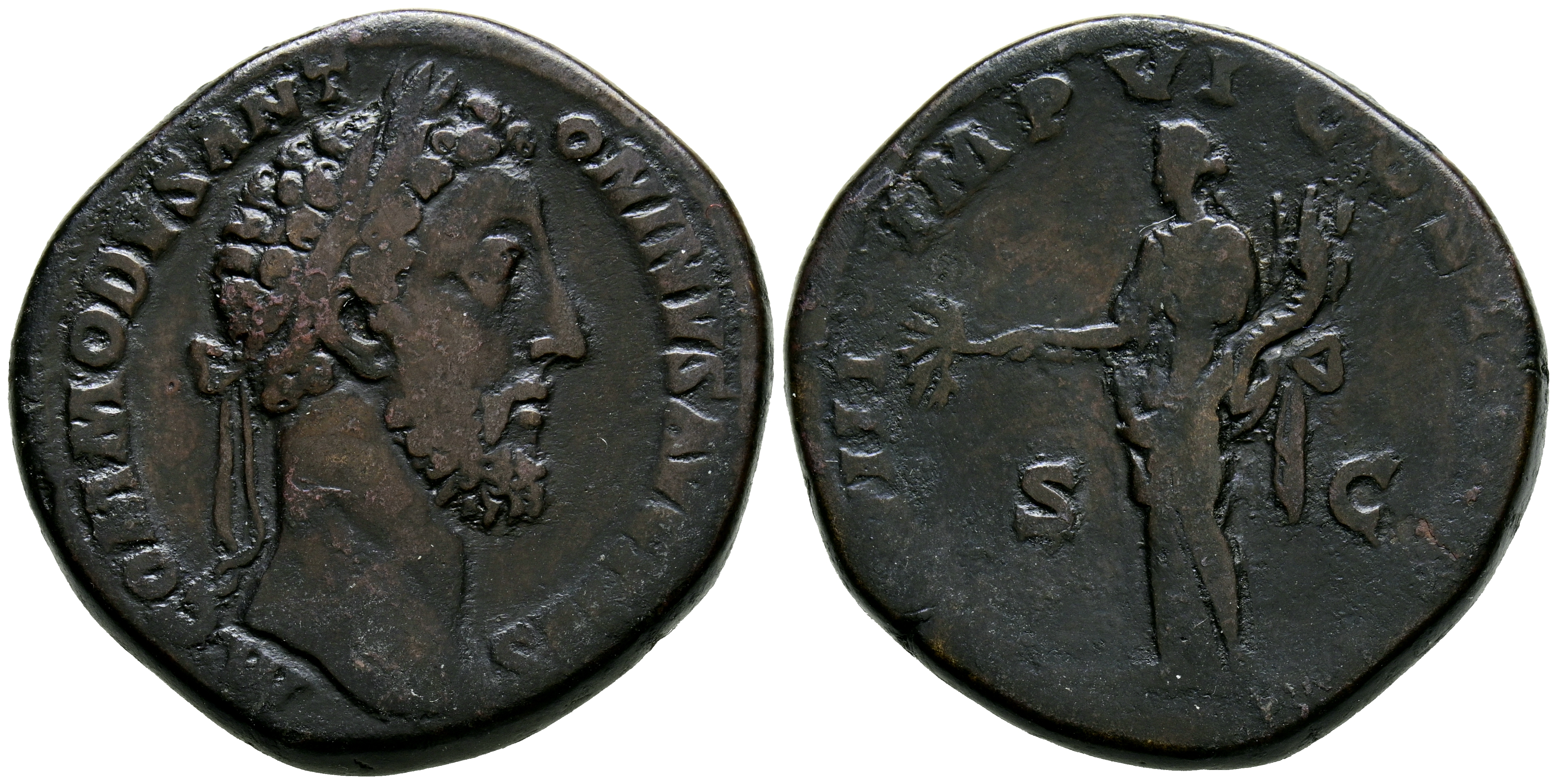 COMODO. Sestercio. (Ae. 23,06g/32mm). 183 d.C. Roma. (RIC 370). Anv: Cabeza laureada de Cómodo a derecha, alrededor leyenda: M COMMODVS ANTONINVS AVG PIVS. Rev: Felicitas estante a izquierda portando rama y cornucopia, entre: S-C, alrededor leyenda: TR P VIII IMP VI COS IIII P P. MBC-. Limpiado.