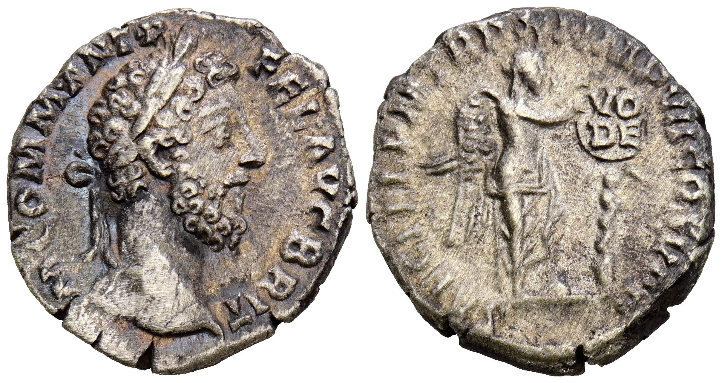 COMODO. Denario. (Ar. 3,40g/18mm). 185 d.C. Roma. (RIC 136). Anv: Busto laureado a derecha. M COMM ANT P FEL AVG BRIT. Rev: Victoria estante a derecha con pie apoyado sobre casco, delante escudo sobre palma, en el escudo inscrito VO-DE, alrededor SAEC FEL P M TR P XI IMP VII COS V P P. MBC.