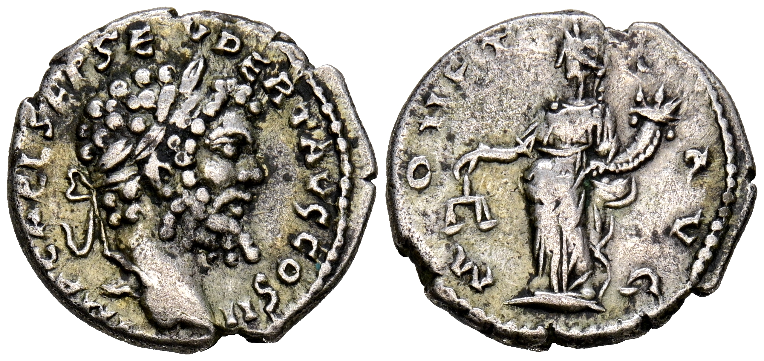 SEPTIMIO SEVERO. Denario. (Ar. 3,05g/18mm). 194-195 d.C. Emesa. (RIC 411a). Anv: Cabeza laureada de Septimio Severo a derecha, alrededor leyenda: IMP CAE L SEP SEV PERT AVG COS II. Rev: Moneta estante a izquierda portando escalas y cornucopia, alrededor leyenda: MONETA AVG. MBC.
