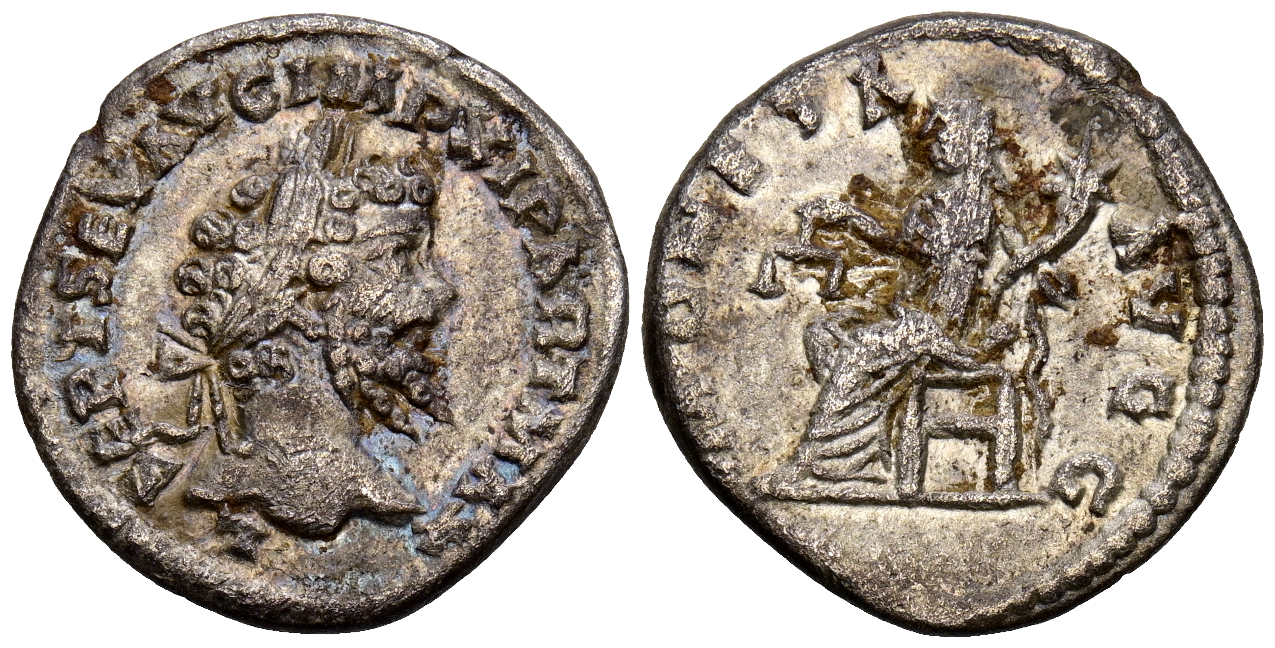 SEPTIMIO SEVERO. Denario. (Ar. 3,32g/18mm). 198-202 d.C. Laodicea ad Mare. (RIC 510a). Anv: Cabeza laureada de Septimio Severo a derecha, alrededor leyenda: SEVERVS AVG IMP XI PART MAX. Rev: Moneta sentada a izquierda portando escalas y cornucopia, alrededor leyenda: MONETA AVGG. MBC+.
