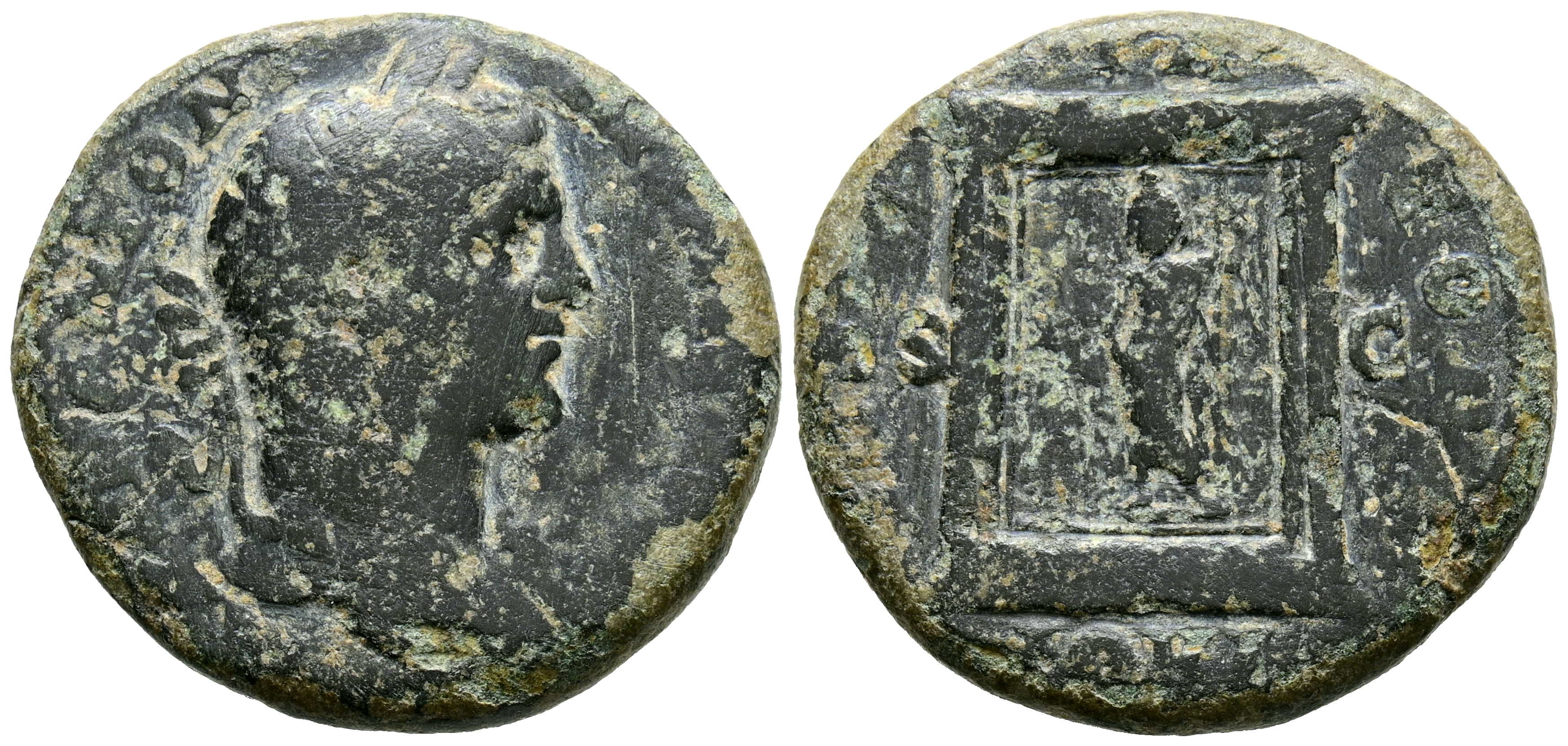 CARACALLA. As. (Ae. 8,28g/24mm). 202-210 d.C. Roma. (RIC 472a). Anv: Busto laureado de Caracalla a la derecha, alrededor leyenda: M AVR ANTONINVS PIVS AVG. Rev: Júpiter estante de frente portando rayo y cetro, dentro de un templo distilo; S-C, alrededor leyenda: IOVI SOSPI TA TORI. BC+/MBC. Rara.