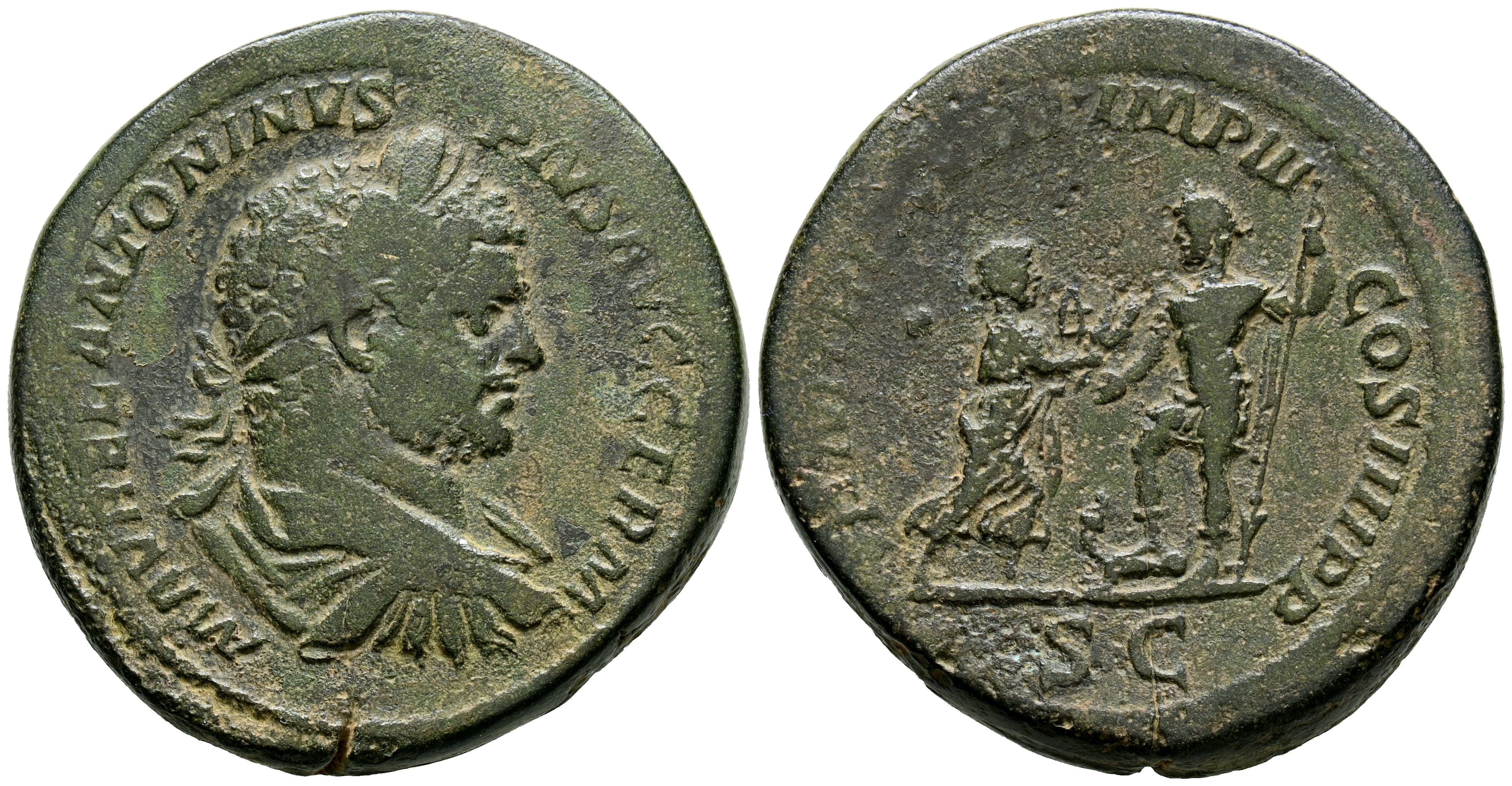 CARACALLA. Sestercio. (Ae. 27,67g/33mm). 215 d.C. Roma. (RIC 544). Anv: Busto laureado, dreapeado y con coraza de Caracalla a derecha, alrededor leyenda: M AVREL ANTONINVS PIVS AVG GERM. Rev: Caracalla con atuendo militar pisando crocodilo y portando lanza y recibiendo granos de Africa portando sistrum, en exergo: SC, alrededor leyenda: P M TR P XVIII IMP III COS IIII P P. MBC. Escaso y atractivo ejemplar.