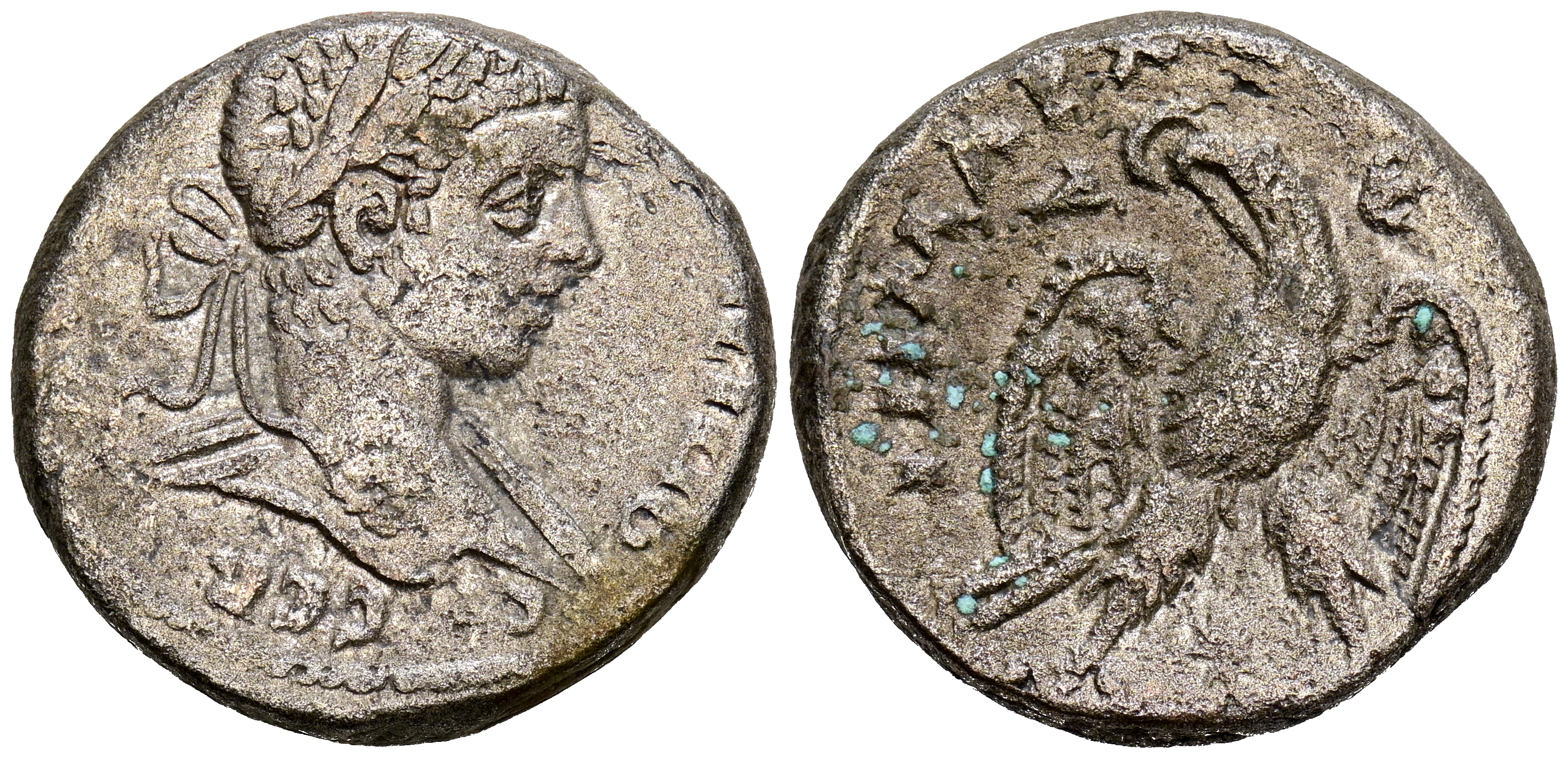 CARACALLA. Tetradracma. (Ae. 11,78g/23mm). 215-217 d.C. Siria, Laodicea ad Mare. (Prieur 1179). Anv: Busto laureado a derecha, alrededor leyenda: AYT K M A ANTON?INOC C?B. Rev: Águila estante a izquierda con corona de laurel en el pico y estrella entre las patas, alrededor leyenda: ?????X ?? ?????C ?? ?. MBC.