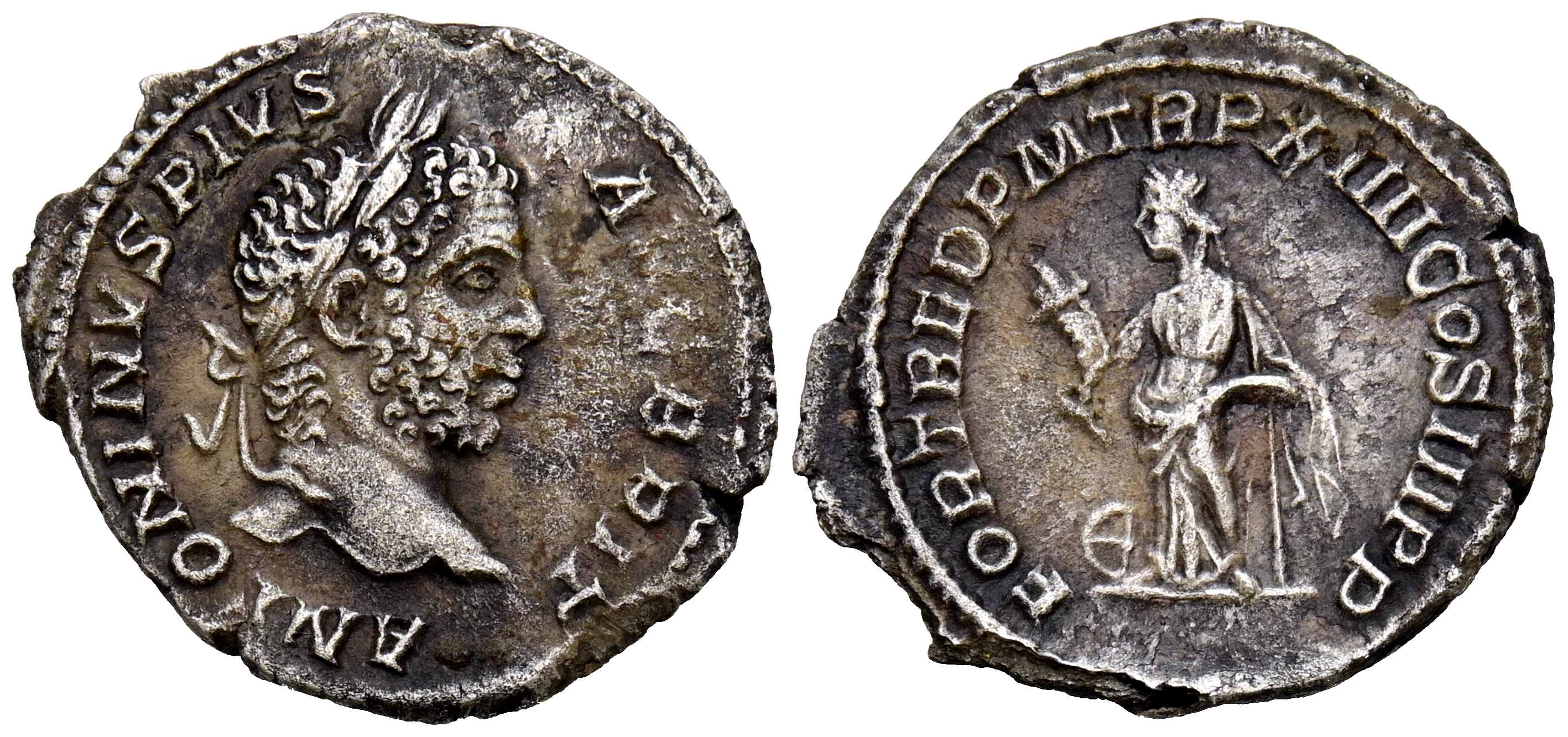 CARACALLA. Denario. (Ar. 2,41g/20mm). 211 d.C. Roma. (RIC 189). Anv: Cabeza laureada de Caracalla a derecha, alrededor leyenda: ANTONINVS PIVS AVG BRIT. Rev: Fortuna estante a izquierda portando cornucopia, apuyada en timón y rueda a sus pies, alrededor leyenda: FORT RED P M TR P XIIII COS III P P. MBC.