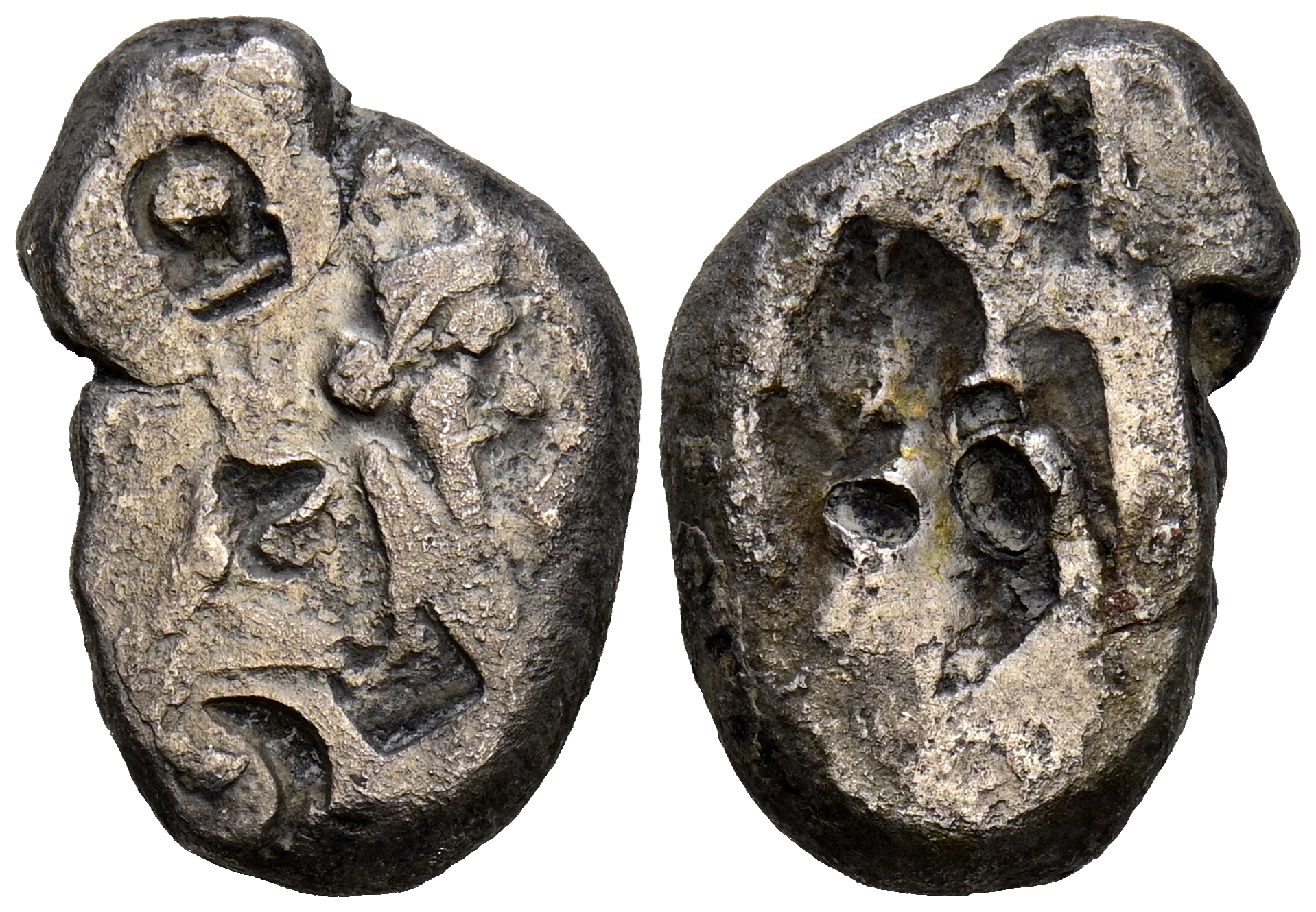 IMPERIO AQUEMENIDA, Tiempo de Jerjes I a Daríos II. Siglos. (Ar. 5,16g/19mm). 485-420 a.C. Sardes. (Sunrise 25). Anv: Rey persa arrodillado a derecha portando arco y lanza y carcaj en su espalda. Rev: Cuadrado incuso. MBC.