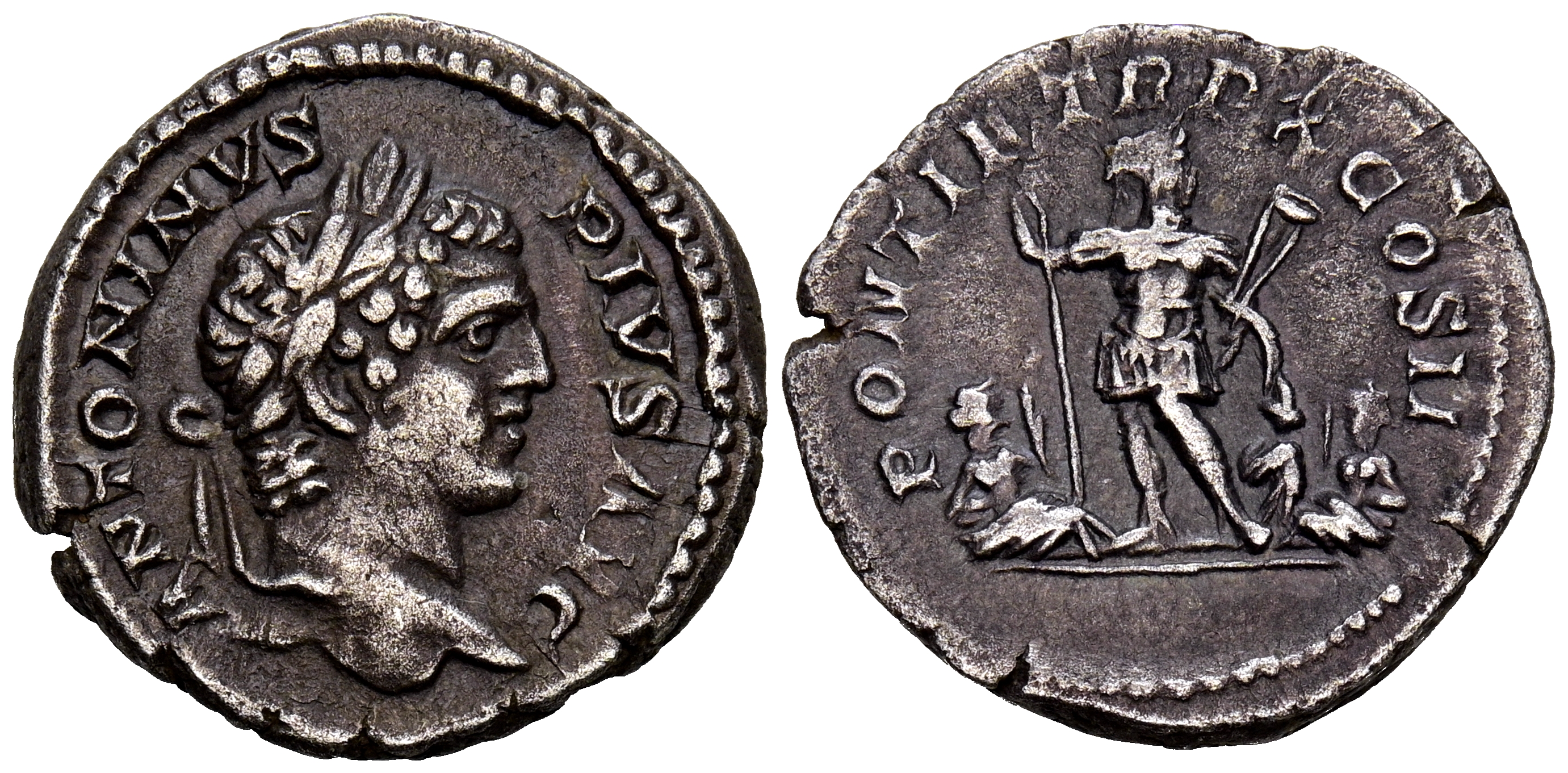 CARACALLA. Denario. (Ar. 3,15g/19mm). 207 d.C. Roma. (RIC 969). Anv: Cabeza laureada de Caracalla a derecha, alrededor leyenda: ANTONINVS PIVS AVG. Rev: Caracalla estante a izquierda mirando a derecha portando lanza y parazonium, a su izquierda el dios río reclinado a derecha y a su derecha dos cautivos a izquierda, alrededor leyenda: PONTIF TR P X COS II. MBC+. Bonito ejemplar.