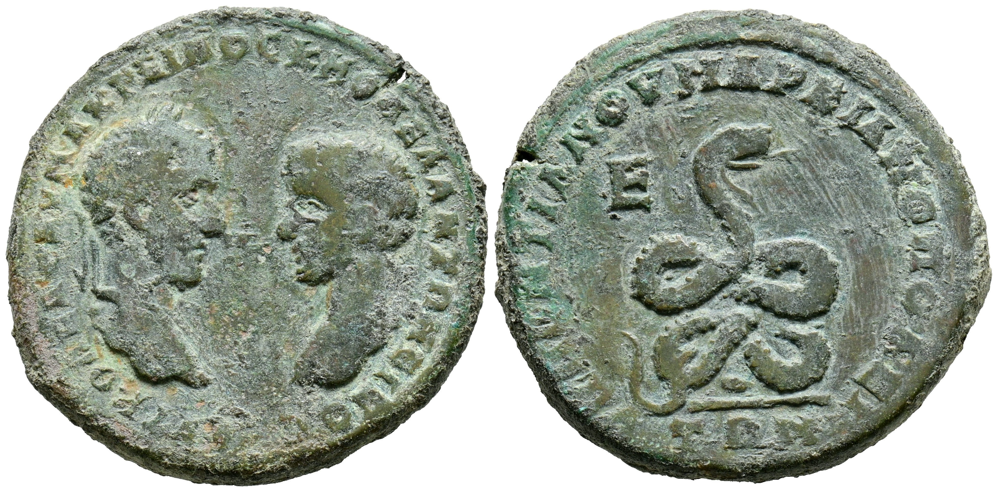 MACRINO con DIADUMENIANO. Pentassarion. (Ae. 11,31g/27mm). 217-218 d.C. Moesia Inferior, Marcianopolis. (Varbanov 1214). Anv: Cabeza laureada de Macrino enfrentada a cabeza de Diadumeniano, alrededor leyenda: AVT K OΠEΛ CEV MAKPINOC K M OΠEΛ ANTΩNEIN OC. Rev: Serpiente a derecha, en campo: E, alrededor leyenda: VΠ ΠONTIANOV MAPKIANOΠOΛEITΩN. MBC-.