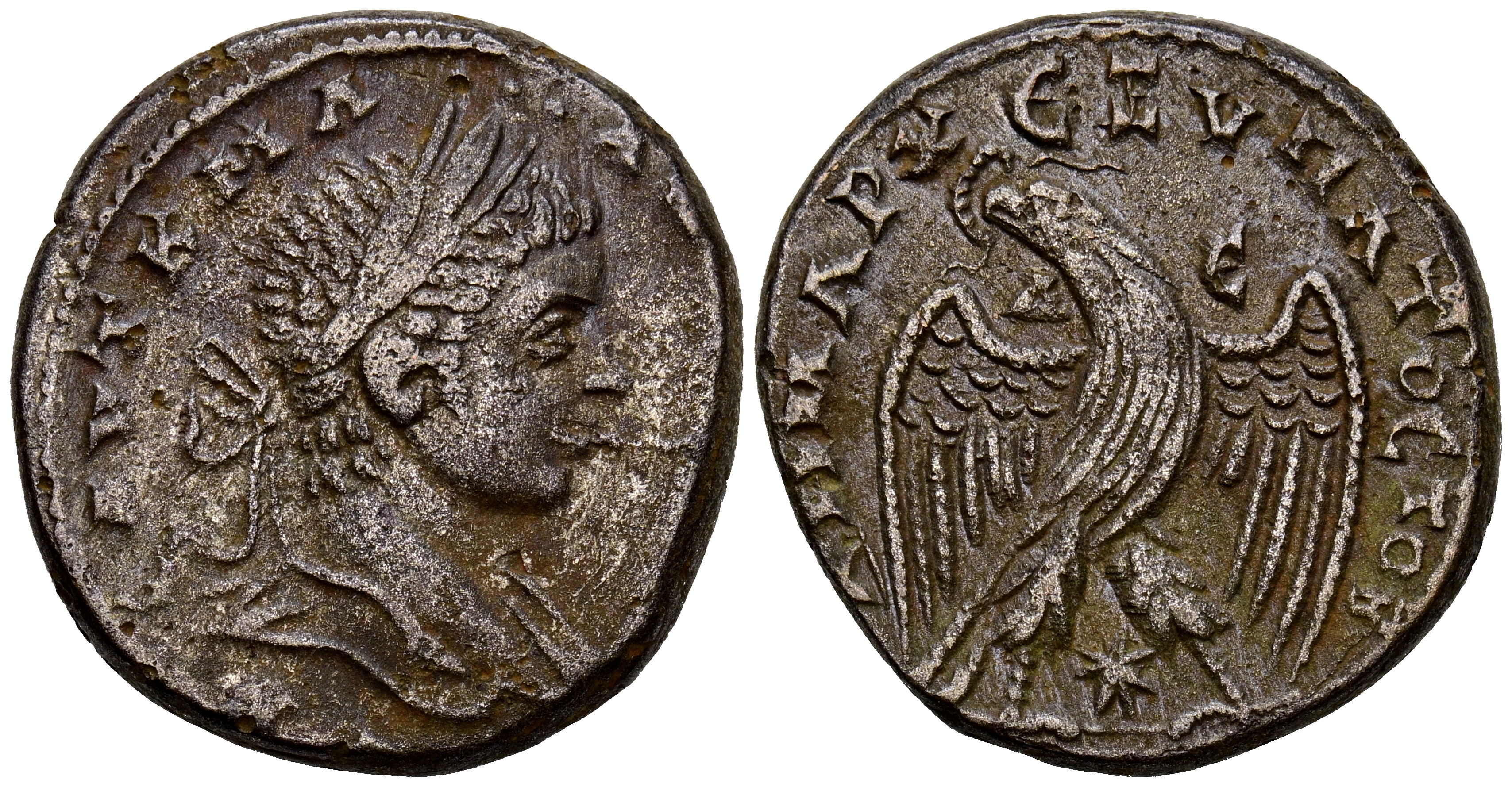 HELIOGABALO. Tetradracma. (Ar. 11,00g/25mm). 219 d.C. Seleucis y Pieria, Antioquía. (Prieur 272; McAlee 763). Anv: Busto laureado, drapeado y con coraza de Heliogábalo a derecha, alrededor leyenda: ΑΥΤ Κ Μ Α ΑΝΤωΝЄΙΝΟC CЄΒ. Rev: Aguila estante a izqu ierda con corona de laurel, entre las patas estrellas y Δ-Є entre la cabeza, alrededor leyenda: ΔΗΜΑΡΧ ЄΞ ΥΠΑΤΟC ΤΟ Β. MBC.