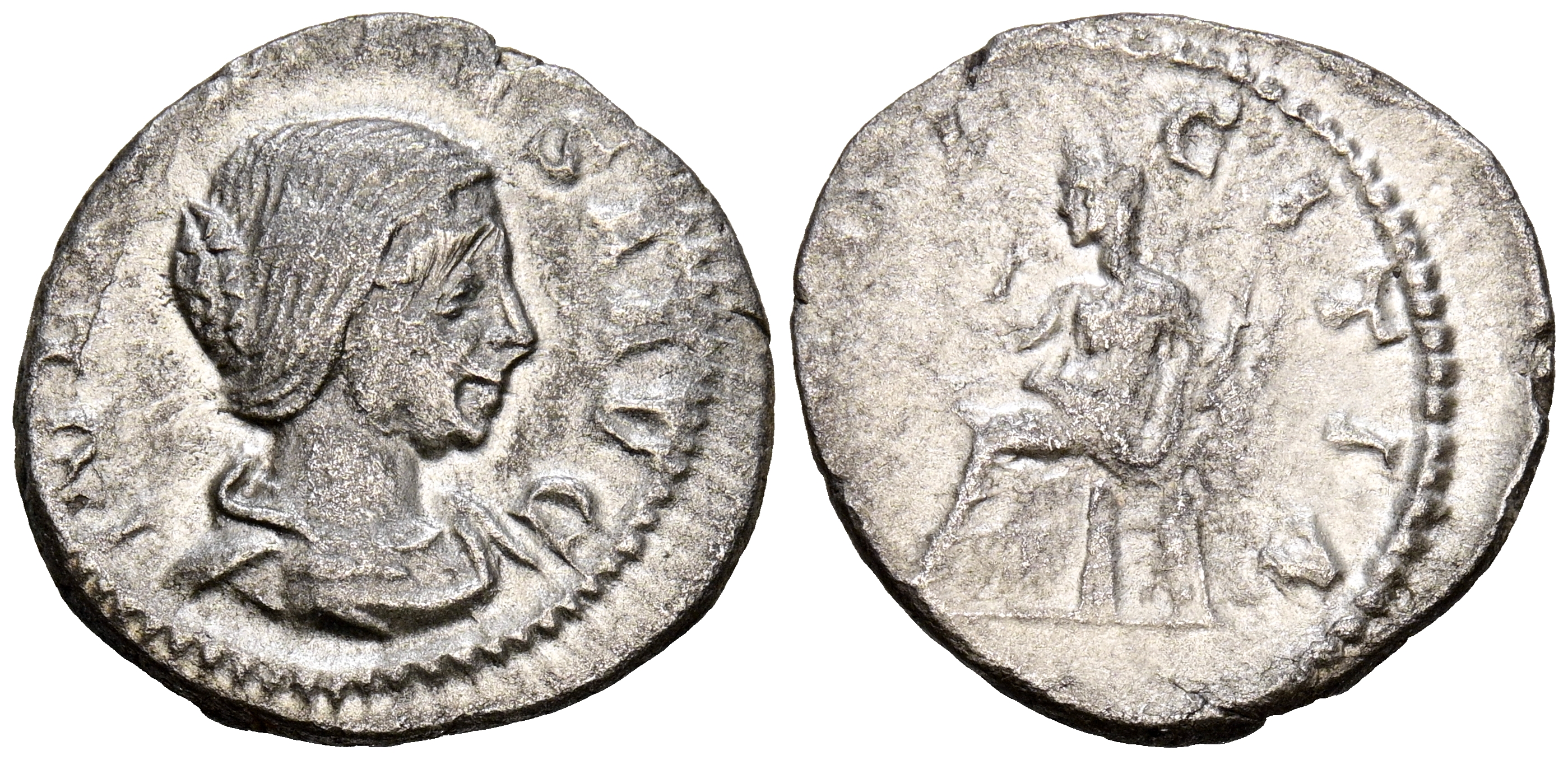 JULIA MAESA. Denario. (Ar. 2,72g/19mm). 218-222 d.C. Roma. (RIC 268). Anv: Busto drapeado de Julia Maesa a derecha, alrededor leyenda: IVLIA MAESA AVG. Rev: Pudicitia sentada a izquierda portando cetro, alrededor leyenda: PVDICITIA. MBC.