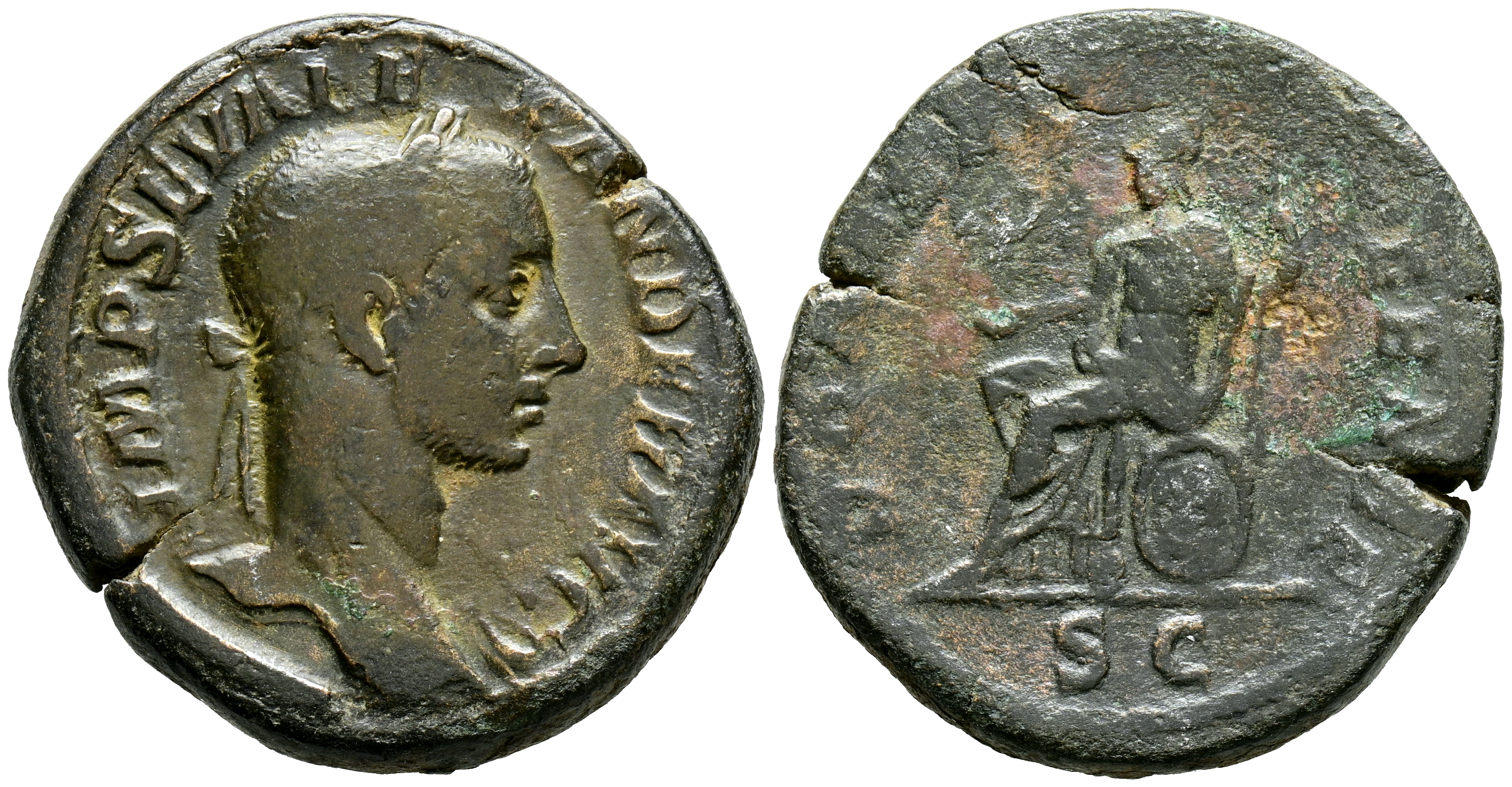 ALEJANDRO SEVERO. Sestercio. (Ae. 20,99g/32mm). 222-231 d.C. Roma. (RIC 602). Anv: Busto laureado con drapeado sobre hombro izquierdo de Alejandro Severo a derecha, alrededor leyenda: IMP SEV ALEXANDER AVG. Rev: Roma sentada a izquierda portando Victoria sobre globo y cetro, en exergo: SC, alrededor leyenda: ROMAE AETERNAE. MBC-/BC+.