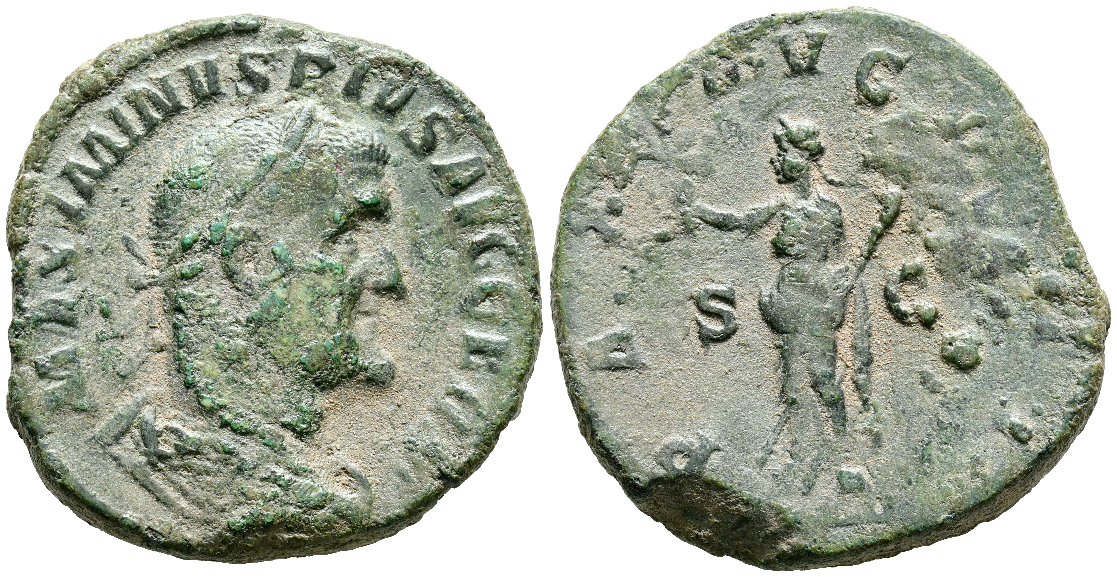MAXIMINO I. Sestercio. (Ae. 22,13g/31mm). 235-236 d.C. Roma. (RIC 58). Anv. Busto laureado, drapeado y con coraza de Maximino I a derecha, alrededor leyenda: IMP MAXIMINVS PIVS AVG. Rev: Pax estante a izquierda portando cetro y rama, entre: S-C, alrededor leyenda: PAX AVGVSTI. MBC.