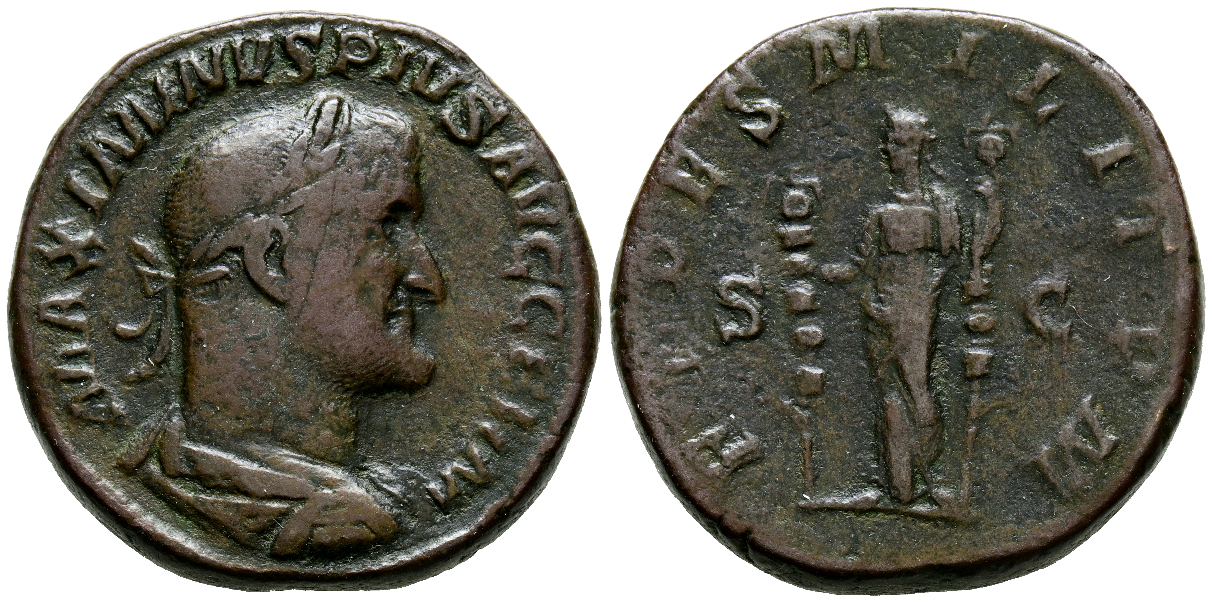 MAXIMINO I. Sestercio. (Ae. 18,96g/30mm). 236-238 d.C. Roma. (RIC 78). Anv: Busto laureado y drapeado de Maximino I a derecha, alrededor leyenda: MAXIMINVS PIVS AVG GERM. Rev: Fides estante a izquierda portando dos estandartes, entre S-C, alrededor leyenda: FIDES MILITVM. MBC-.