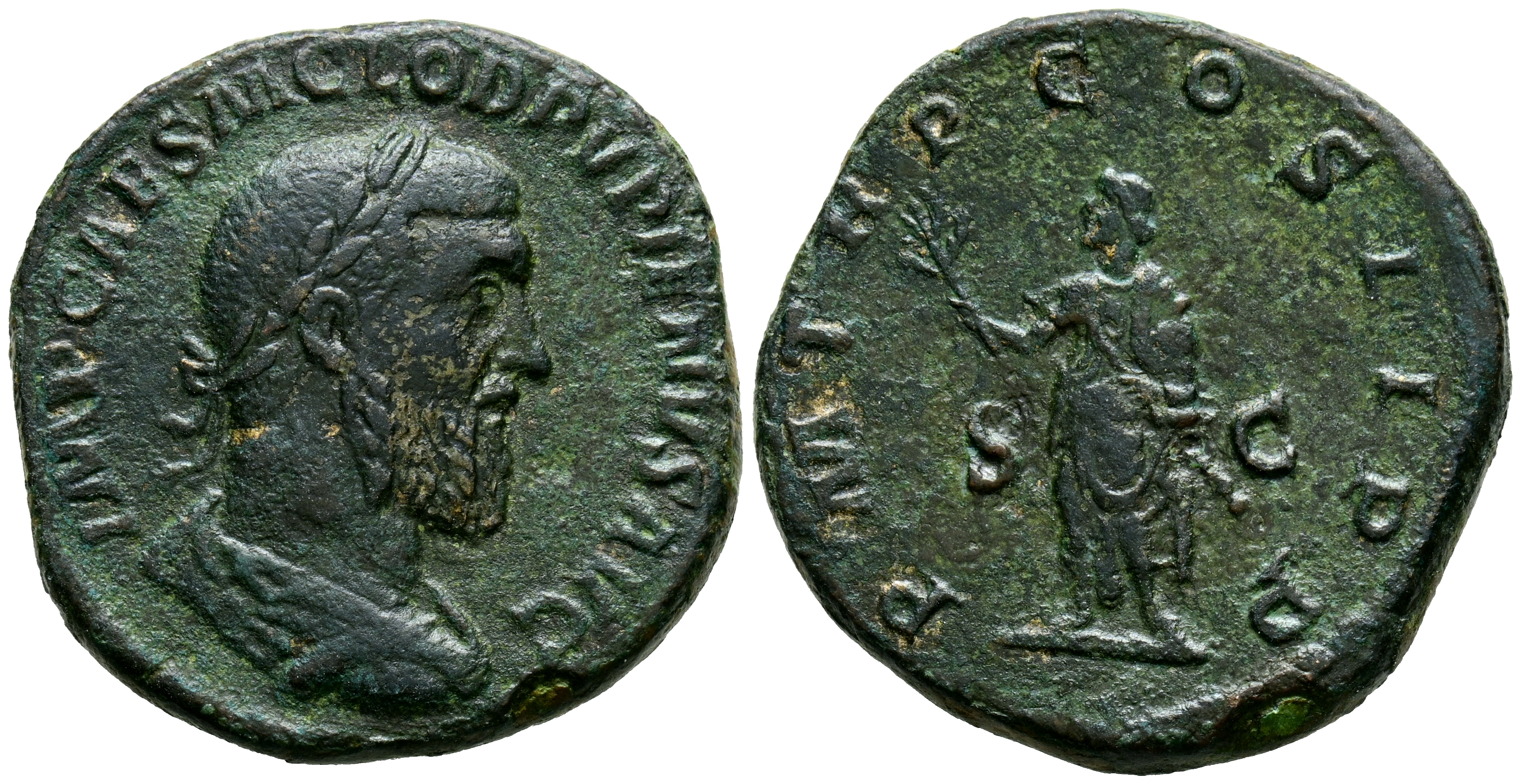 PUPIENO. Sestercio. (Ae. 14,98g/30mm). 238 d.C. Roma. (RIC 15). Anv: Busto laureado y drapeado de Pupieno a derecha, alrededor leyenda: IMP CAES M CLOD PVPIENVS AVG. Rev: Pupieno estante a izquierda portando rama de olivo y parazonium, entre: S-C, alrededor leyenda: P M TR P COS II PP. MBC. Repasado y repatinado. Escaso ejemplar.