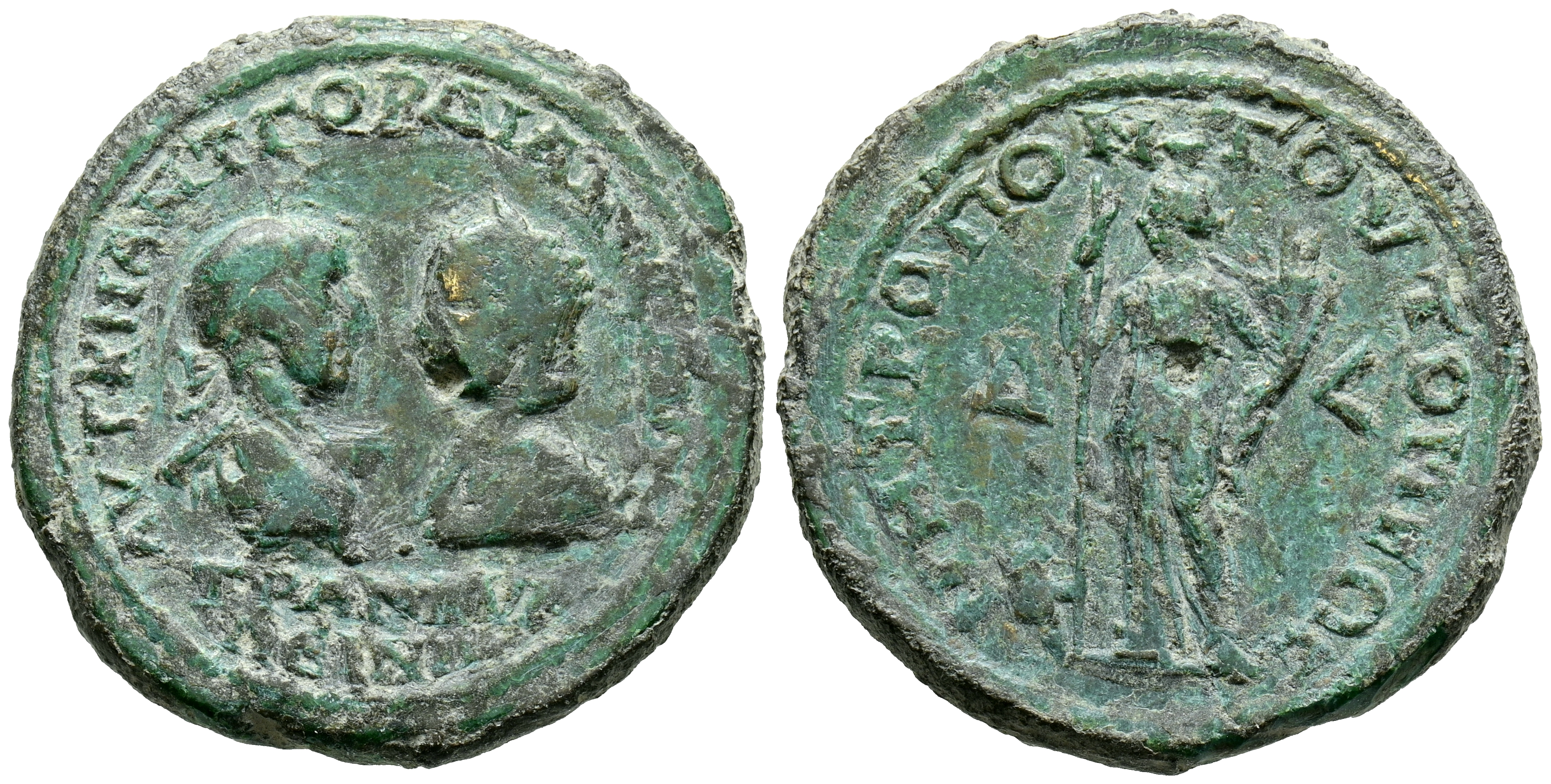 GORDIANO III con TRANQUILINA. Tetrakaihemiassarion. (Ae. 12,65g/29mm). 238-244 d.C. Moesia Inferior, Tomis. (RPC 1722). Anv: Bustos laureado y drapeados de Gordiano III y Tranquilina enfrentadas, debajo leyenda: ΤΡΑΝΚΥΛΙΝΑ, alrededor leyenda: ΑΥΤ Κ Μ ΑΝΤΩΝ ΓΟΡΔΙΑΝΟϹ Ϲ. Rev: Tyche estante a izquierda portando centro y cornucopia, entre: Δ-<, a sus pies cautivo a izquierda, alrededor leyenda: MHTPO ΠONTOV TOMEΩC. MBC.