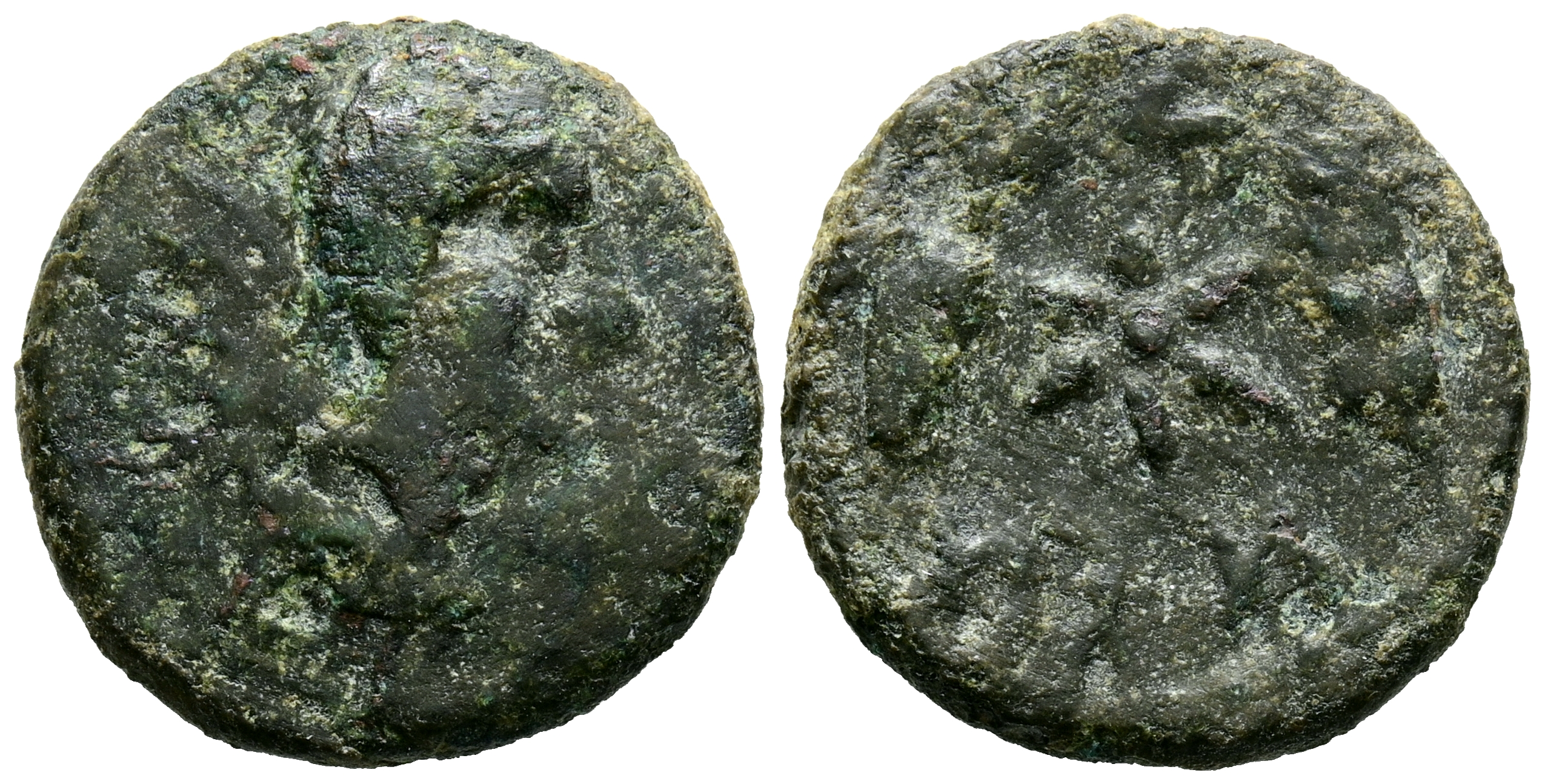 REYES DE MAURITANIA, Boccus I y sucesores. Ae17. (Ae. 3,50g/17mm). 118-133 a.C. Ceca: ŠMŠ. (Mazard 644 (Lixus); MAA 45; SNG Copenhagen 705 (Lixus)). Anv: Cabeza barbuda derecha. Rev: Estrella; sobre ella símbolo, a los lados racimo de uva y mazorca. MBC-.