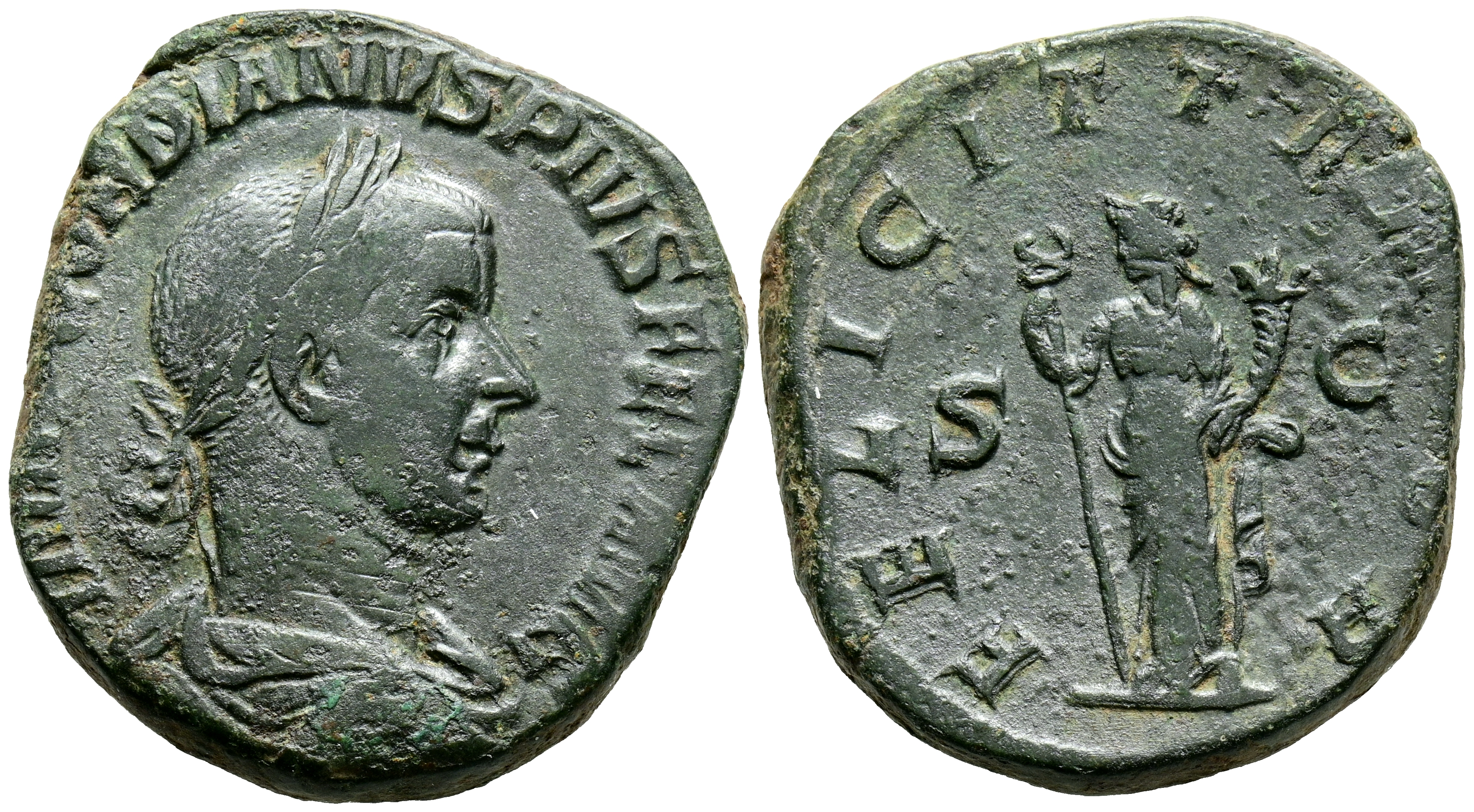 GORDIANO III. Sestercio. (Ae. 18,50g/30mm). 243-244 d.C. Roma. (RIC 328a). Anv: Busto laureado y drapeado de Gordiano III a derecha, alrededor leyenda: IMP GORDIANVS PIVS FEL AVG. Rev: Felicitas estante a izquierda portando caduceo y cetro, entre: S-C, alrededor leyenda: FELICITAS TEMPOR. MBC.