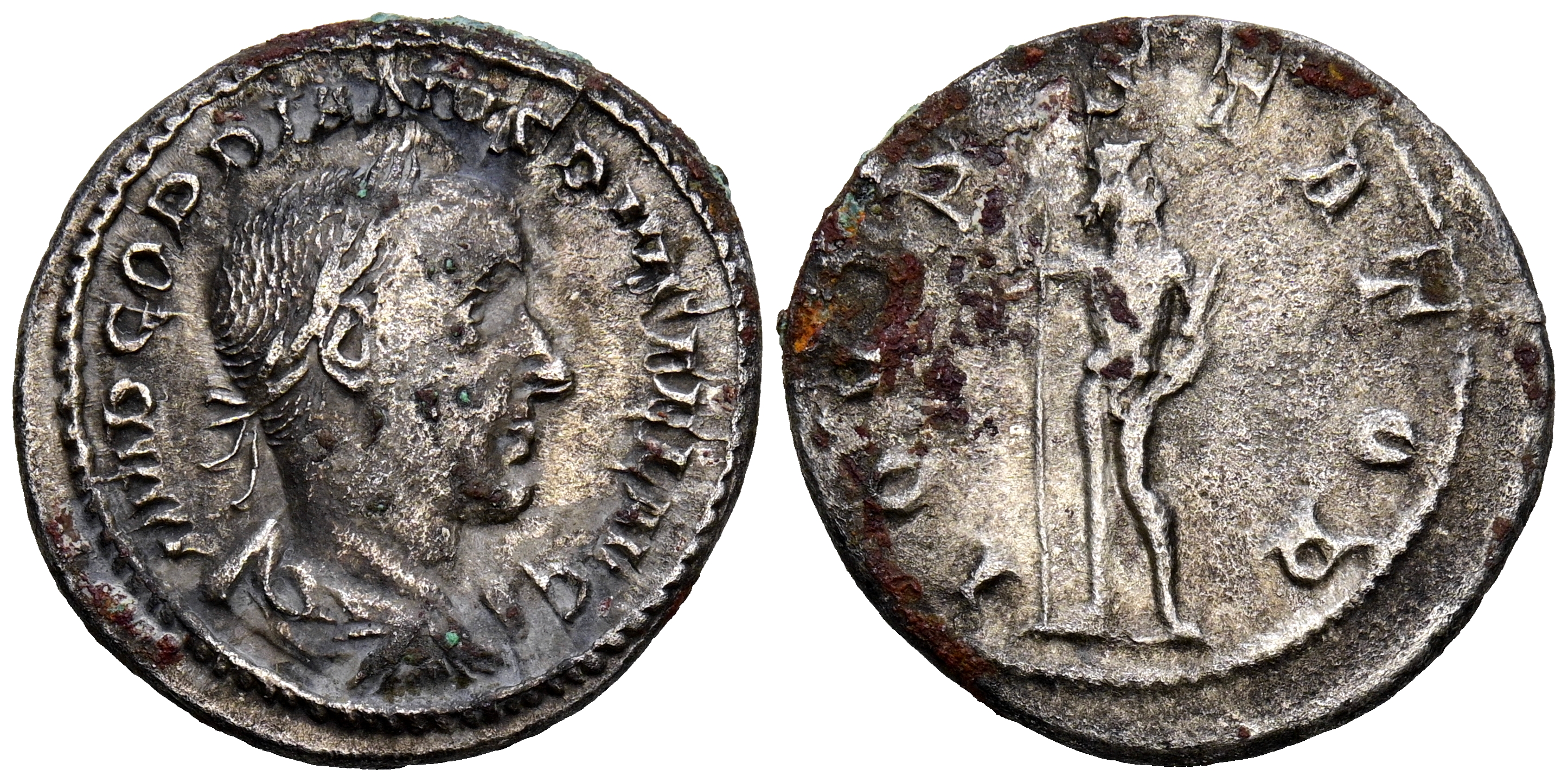 GORDIANO III. Denario. (Ar. 2,97g/20mm). 241 d.C. Roma. (RIC 112). Anv: Laureado y busto drapeado de Gordiano III a la derecha, alrededor de la leyenda: IMP GORDIANVS PIVS FEL AVG. Rev: Júpiter de pie a la izquierda portando lanza y cornucopia, alrededor de la leyenda: IOVIS STATOR. MBC. Oxidaciones.
