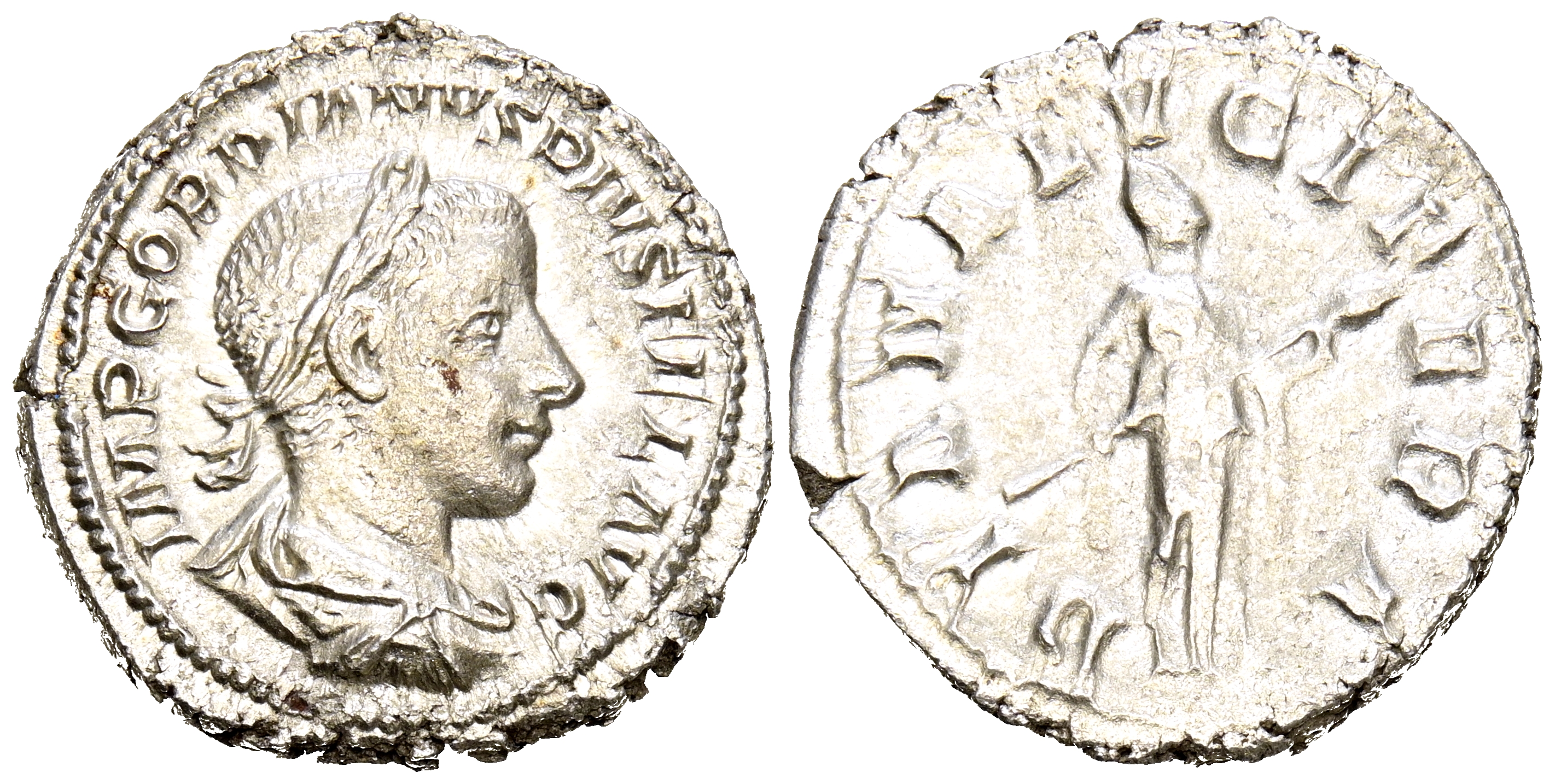 GORDIANO III. Denario. (Ar. 3,50g/20mm). 241 d.C. Roma. (RIC 127). Anv: Laureado y busto drapeado de Gordiano III a derecha, alrededor leyenda: IMP GORDIANVS PIVS FEL AVG. Rev: Diana estante a derecha portando antorcha, alrededor leyenda: DIANA LVCIFERA. MBC+.