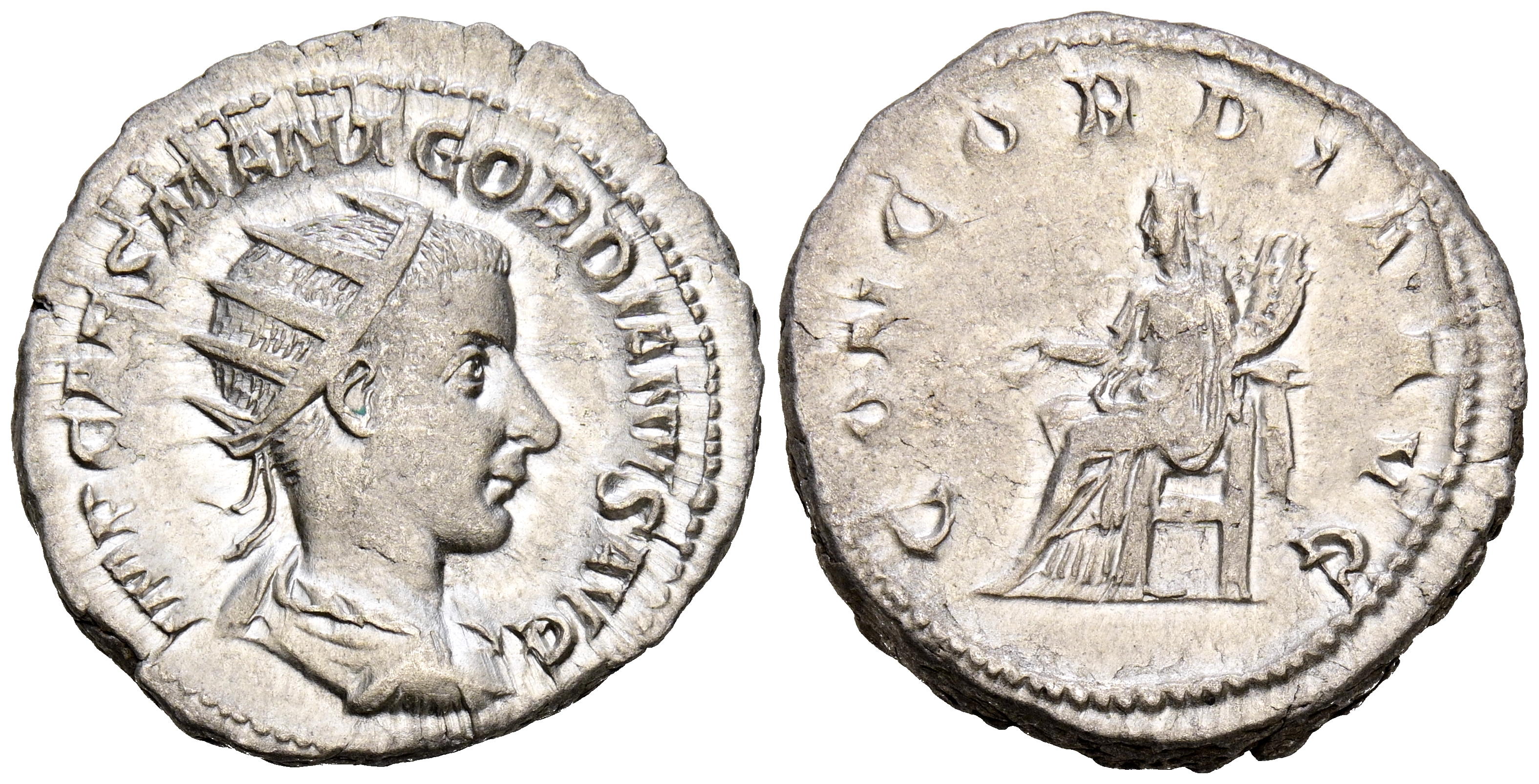 GORDIANO III. Antoniniano. (Ar. 4,76g/22mm). 240 d.C. Roma. (RIC 35). Anv: Busto radiado y drapeado de Gordiano III a derecha, alrededor leyenda: IMP CAES M ANT GORDIANVS AVG. Rev: Concordia sentada a izquierda portando patera y doble cornucopia, alrededor leyenda: CONCORDIA AVG. MBC+.