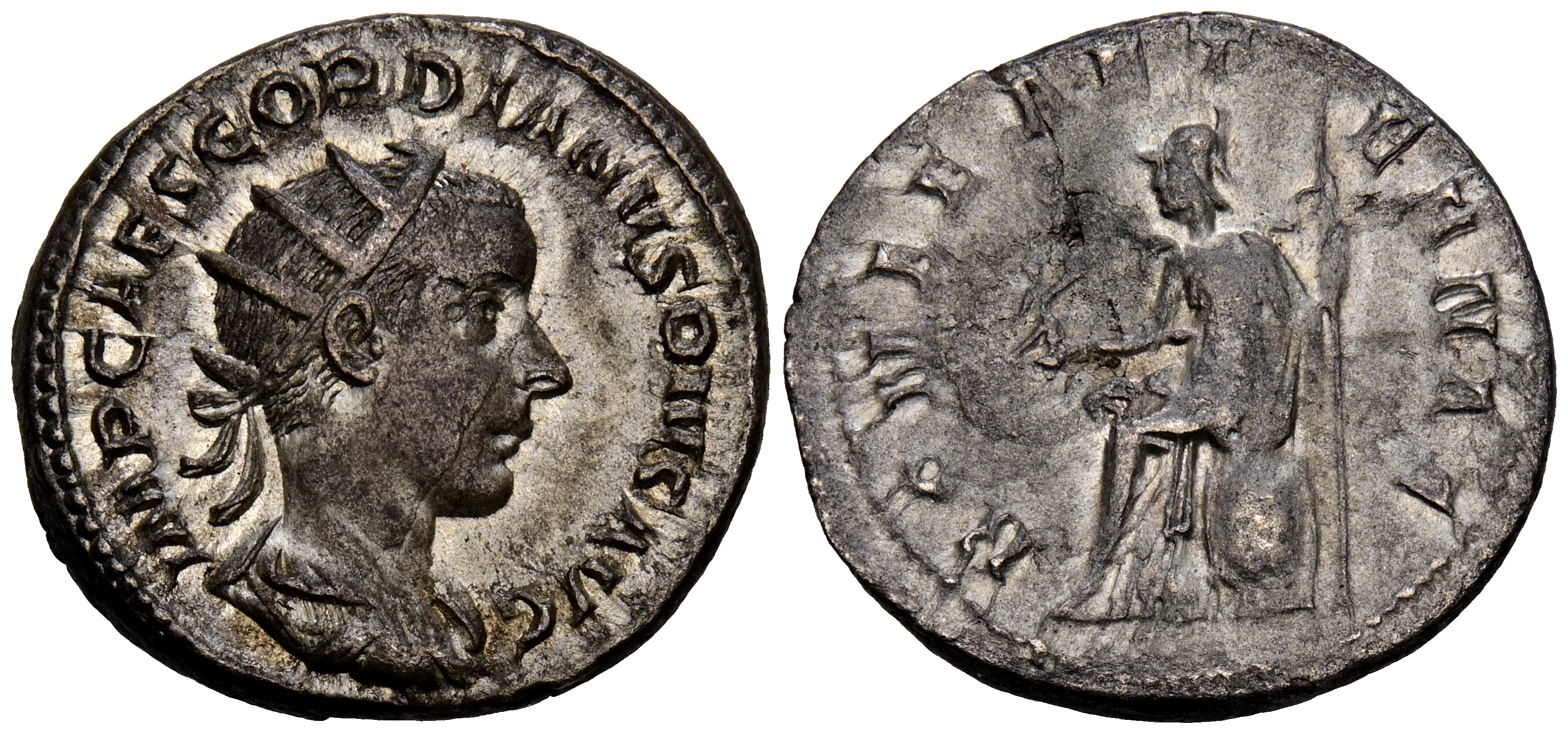 GORDIANO III. Antoniniano. (Ar. 4,79g/22mm). 240 d.C. Roma. (RIC 70). Anv: Busto radiado y drapeado de Gordiano III a derecha, alrededor leyenda: IMP GORDIANVS PIVS FEL AVG. Rev: Roma sentada a izquierda sobre escudo, portando lanza y Victoria con corona de laurel, alrededor leyenda: ROMAE AETERNAE. EBC-/MBC.