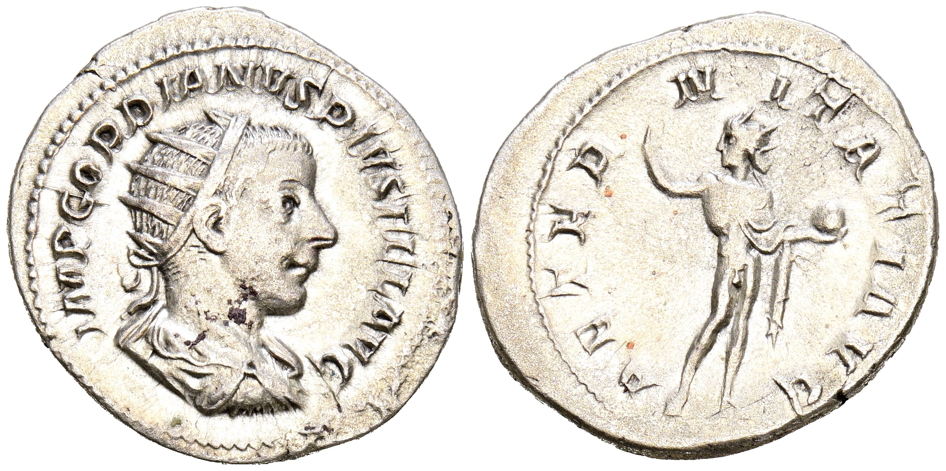 GORDIANO III. Antoniniano. (Ar. 3,82g/23mm). 241-243 d.C. Roma. (RIC 83). Anv: Busto radiado y drapeado de Gordiano III a derecha, alrededor leyenda: IMP GORDIANVS PIVS FEL AVG. Rev: Sol estante a izquierda alzando mano y portando globo, alrededor leyenda: AETERNITATI AVG. MBC.