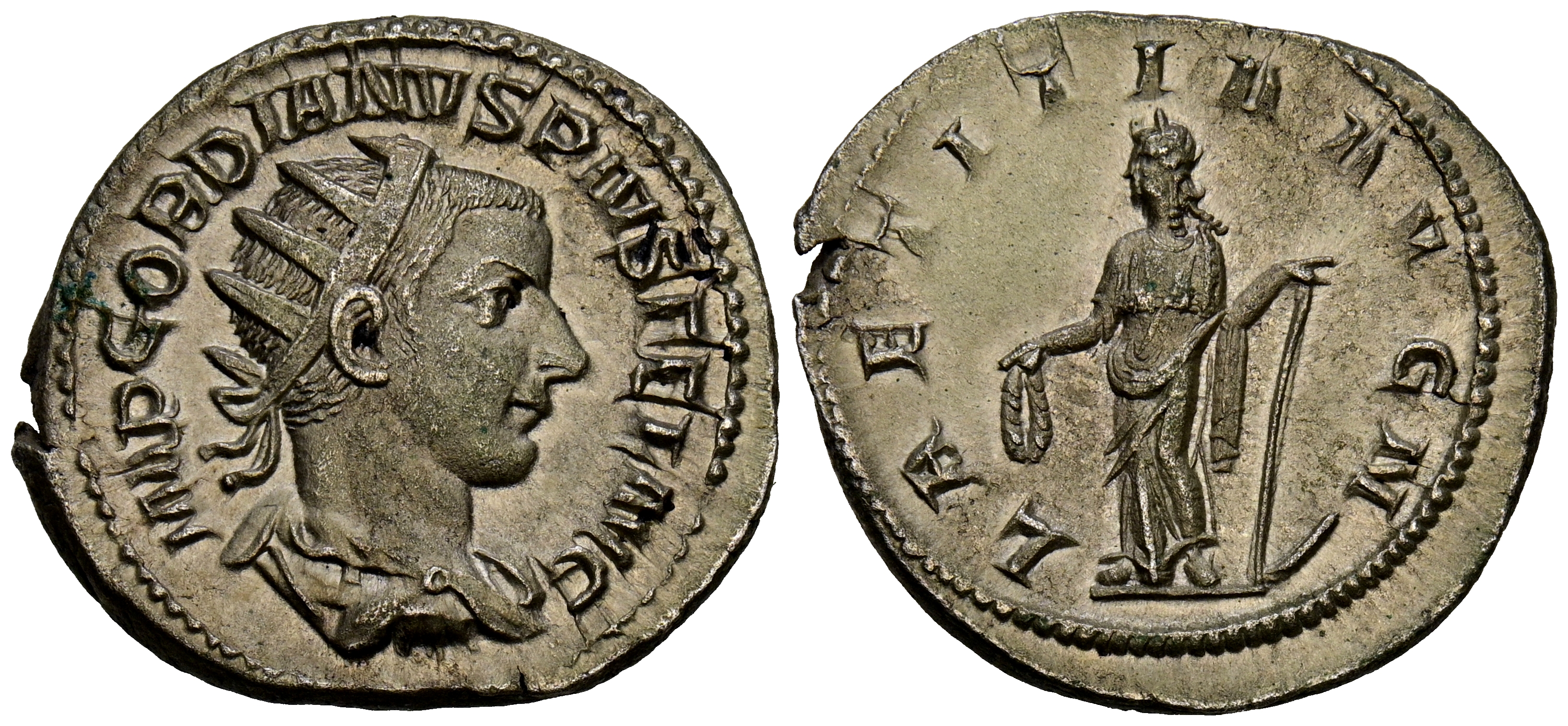 GORDIANO III. Antoniniano. (Ar. 4,57g/23mm). 241-243 d.C. Roma. (RIC 86). Anv: Busto radiado y drapeado de Gordiano III a derecha, alrededor leyenda: IMP GORDIANVS PIVS FEL AVG. Rev: Laetitia estante a izquierda portando corona de laurel y cetro, alrededor leyenda: LAETITIA AVG N. EBC. Atractivo ejemplar.