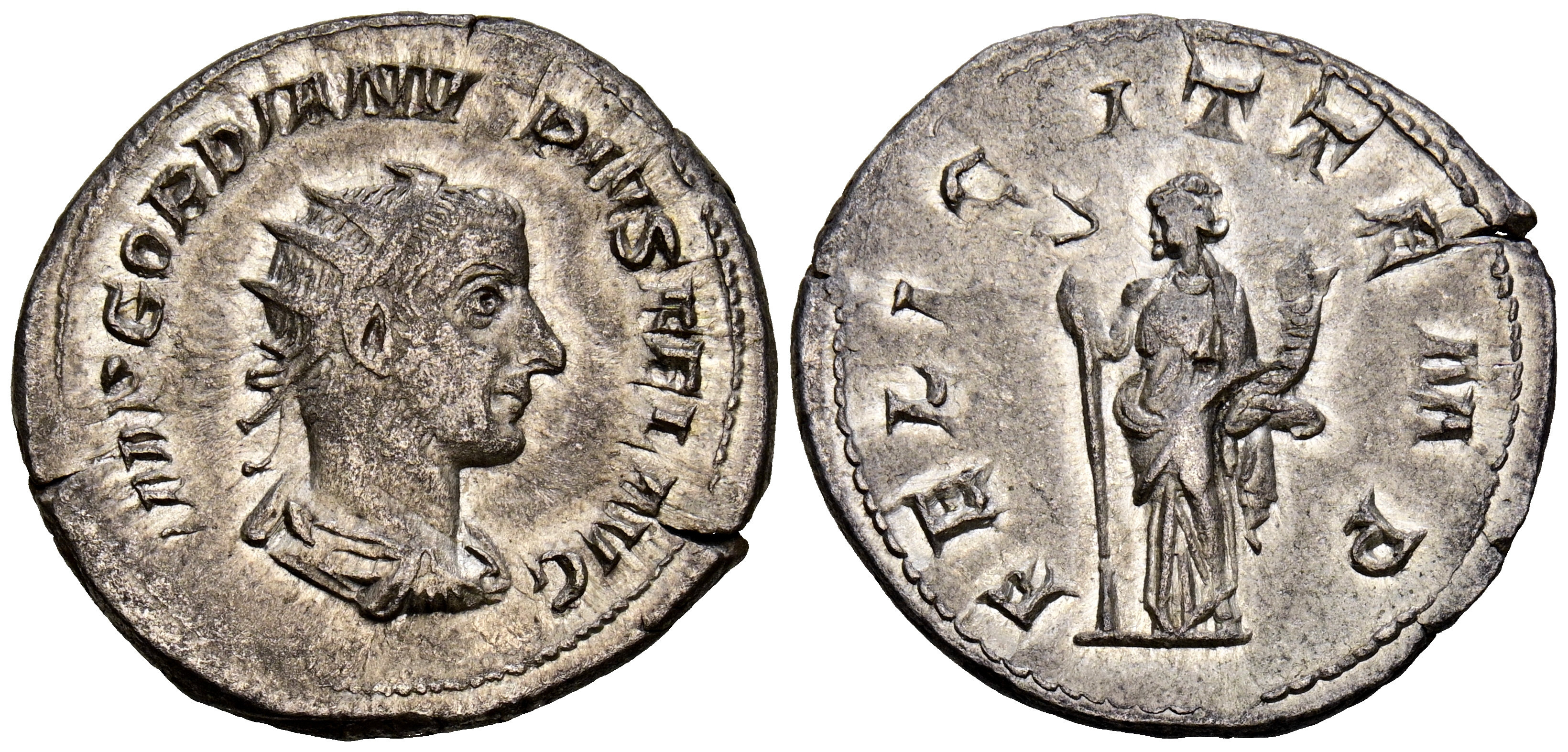 GORDIANO III. Antoniniano. (Ar. 4,16g/23mm). 243-244 d.C. Roma. (RIC 140). Anv: Busto radiado y drapeado de Gordiano III a derecha, alrededor leyenda: IMP GORDIANVS PIVS FEL AVG. Rev: Felicitas estante a izquierda portando caduceo y cornucopia, alrededor leyenda: FELICIT TEMP. EBC-. Bonito ejemplar con ligeros restos de brillo original.