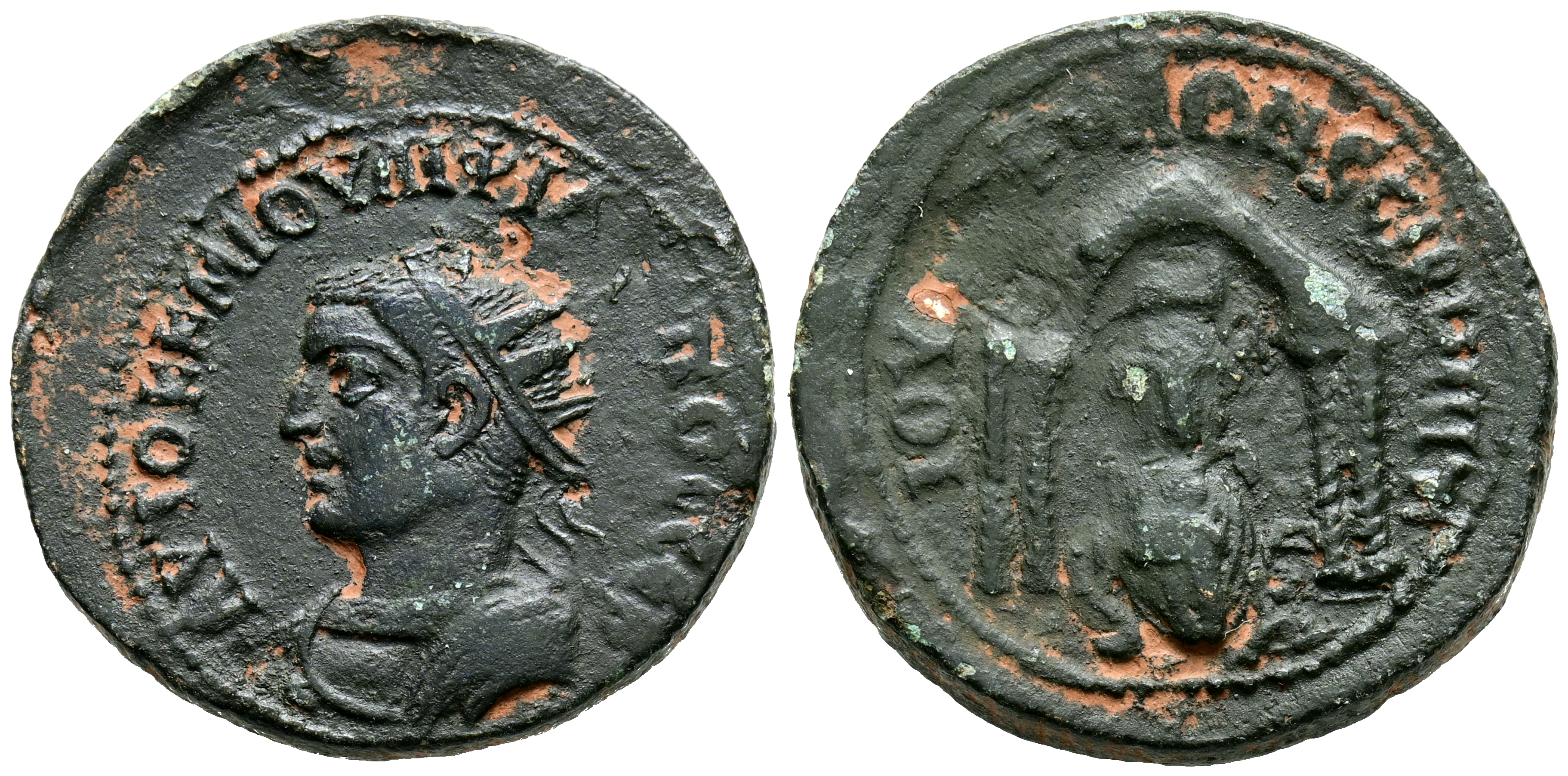 FILIPO II. Ae25. (Ae. 11,31g/25mm). 247-249 d.C.  Nísibis, Mesopotamia. (RIC 1962). Anv: Busto radiado, drapeado y acorazado de Filipo II a la izquierda, alrededor leyenda: AYTOK M IOVΛI ΦIΛIΠΠOC CЄB. Rev: Tyche de Antioquía sentada de frente; arriba , carnero saltando a la derecha, todo dentro de templo tetrástilo; abajo, dios-río Éufrates nadando a la derecha, alrededor leyenda: IOY CЄΠ KOΛΩ NЄCIBI MHT. MBC.