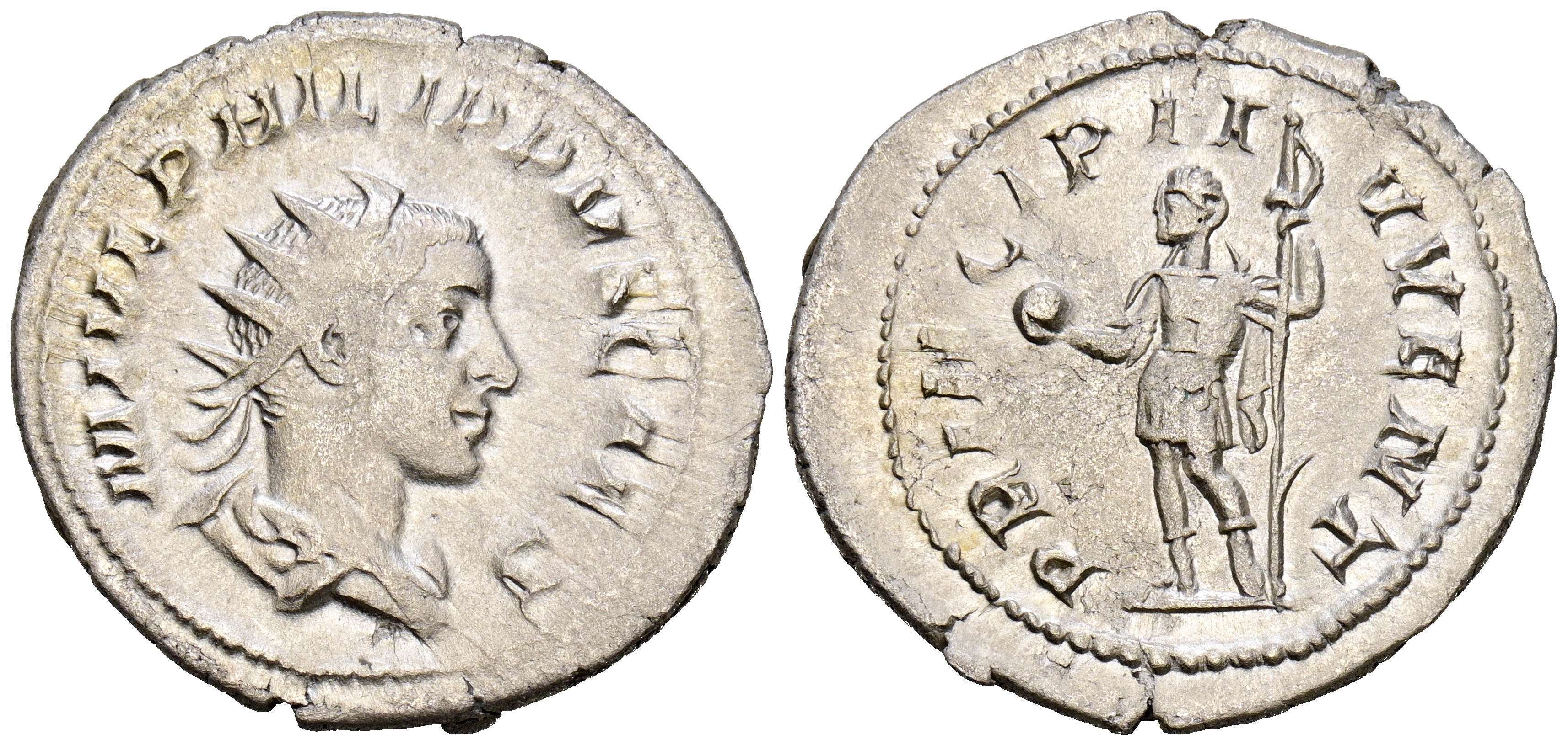 FILIPO II. Antoniniano. (Ar. 3,56g/24mm). 244-246 D.C. Roma. (RIC 216c). Anv: Busto radiado y drapeado de Filipo II a derecha, alrededor leyenda: M IVL PHILIPPVS AVG. Rev: Filipo II estante a izquierda portando globo y lanza, alrededor leyenda: PRINCIPI IVVENT. MBC+.