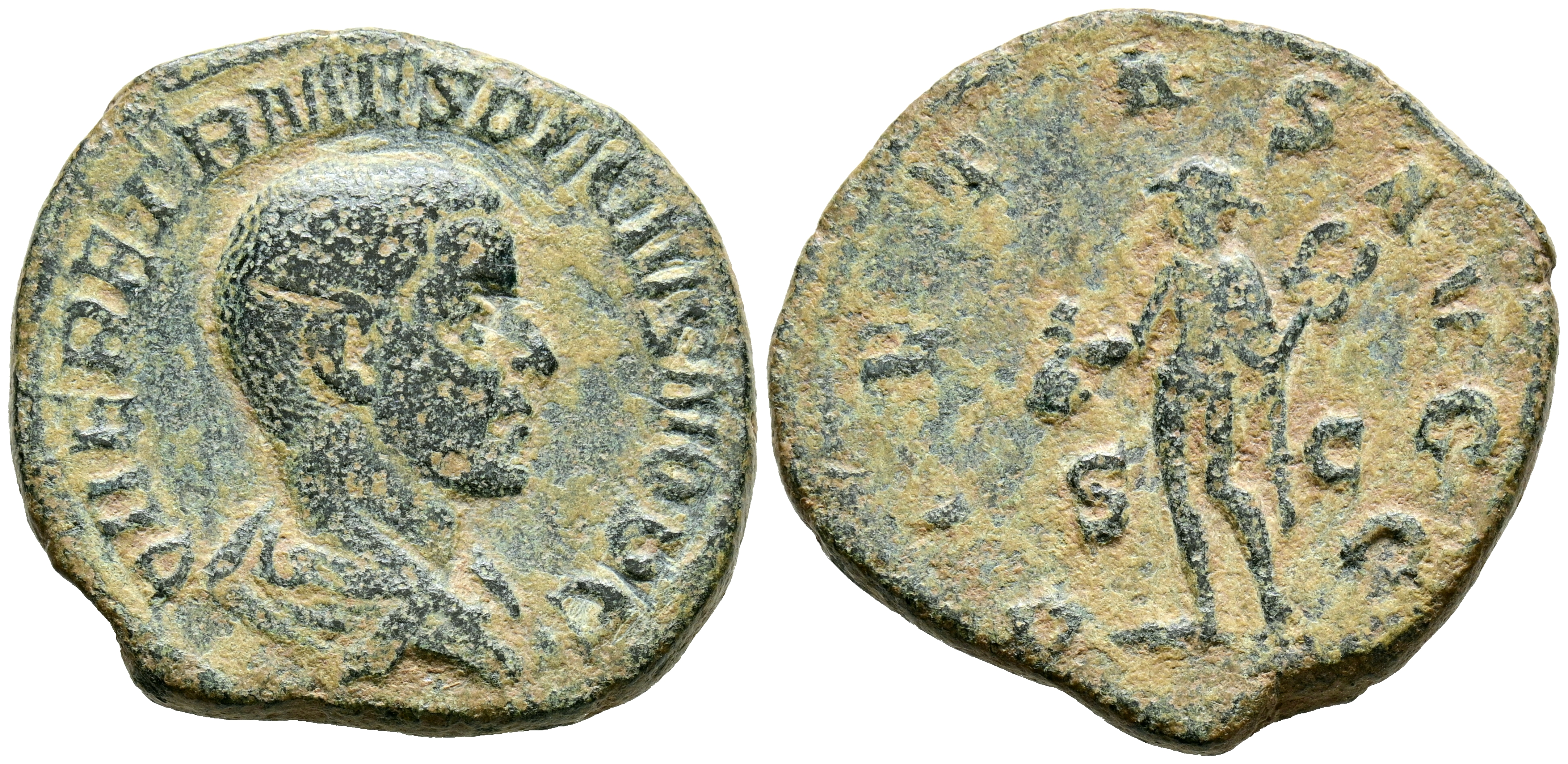 HERENIO ETRUSCO. Sestercio. (Ae. 16,12g/31mm). 250-251 d.C. Roma. (RIC 167a). Anv: Busto drapeado de Herenio Etrusco a derecha, alrededor leyenda: Q HER ETR MES DECIVS NOB C. Rev: Mercurio estante a izquierda portando caduceo y bolsa, entre S-C, alrededor leyenda: PIETAS AVGG. MBC-.