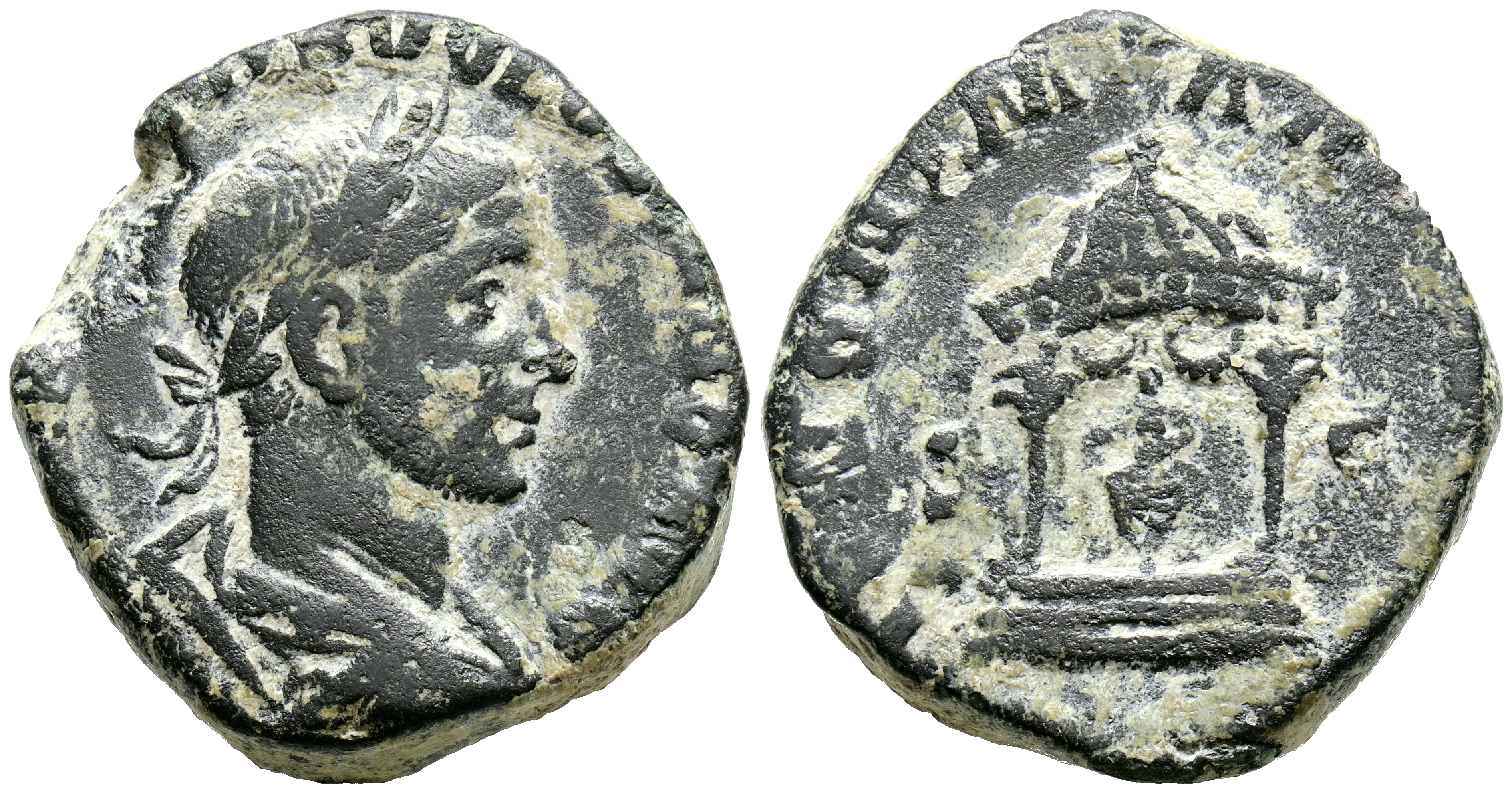 VOLUSIANO. Sestercio. (Ae. 17,64g/28mm). 253 d.C. Roma. (RIC 253a). Anv: Busto laureado y drapeado de Volusiano a derecha, alrededor leyenda: IMP CAE C VIB VOLVSIANO AVG. Rev: Juno sentado de frente dentro de templo, entre: S-C, alrededor leyenda: IVNONI MARTIALI. MBC-.