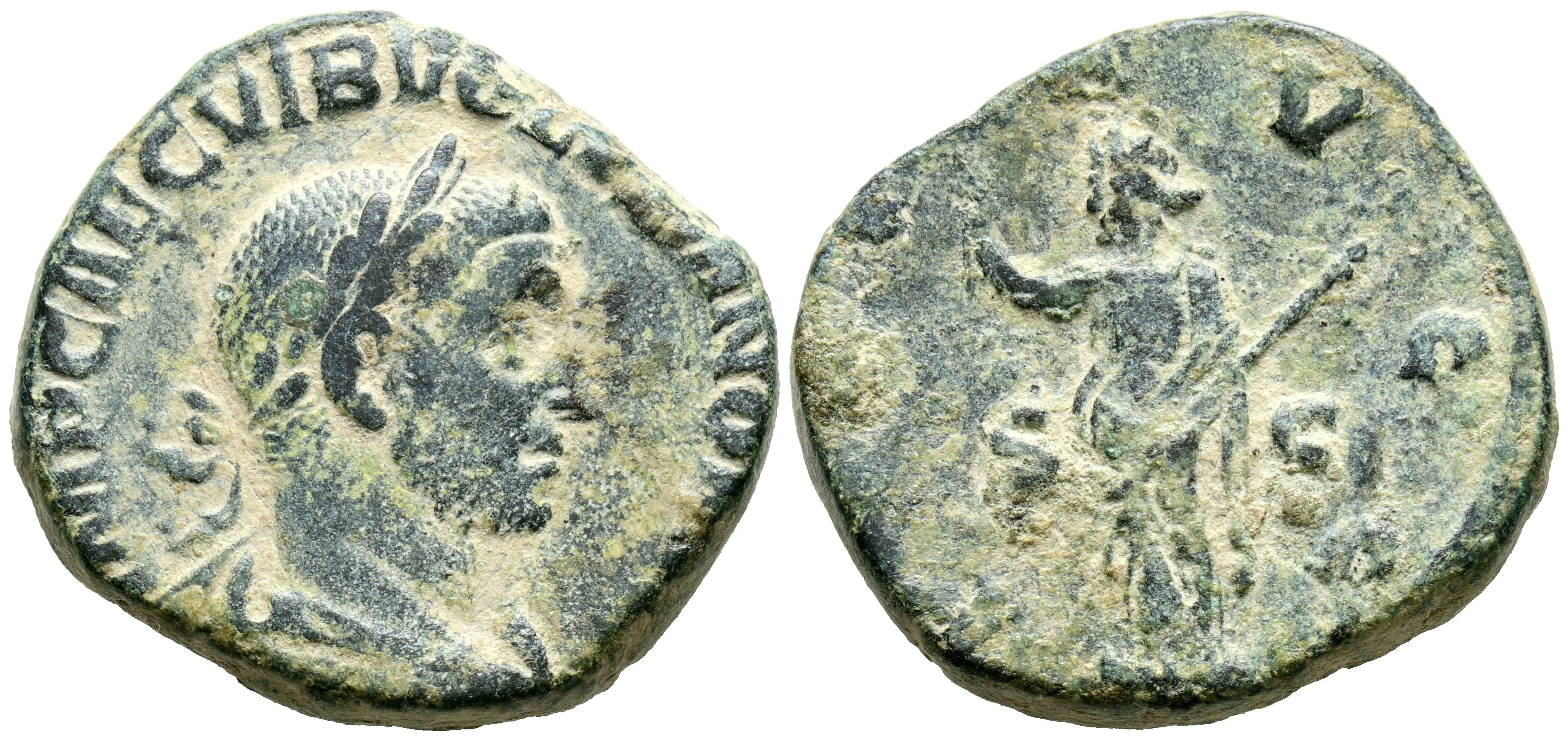 VOLUSIANO. Sestercio. (Ae. 17,70g/27mm). 251-253 d.C. Roma. (RIC 256a). Anv: Busto laureado y drapeado de Volusiano a derecha, alrededor leyenda: IMP CAE C VIB VOLUSIANO AVG. Rev: Pax estante a izquierda portando cetro y rama, entre: S-C, alrededor leyenda: PAX AVG. MBC-.