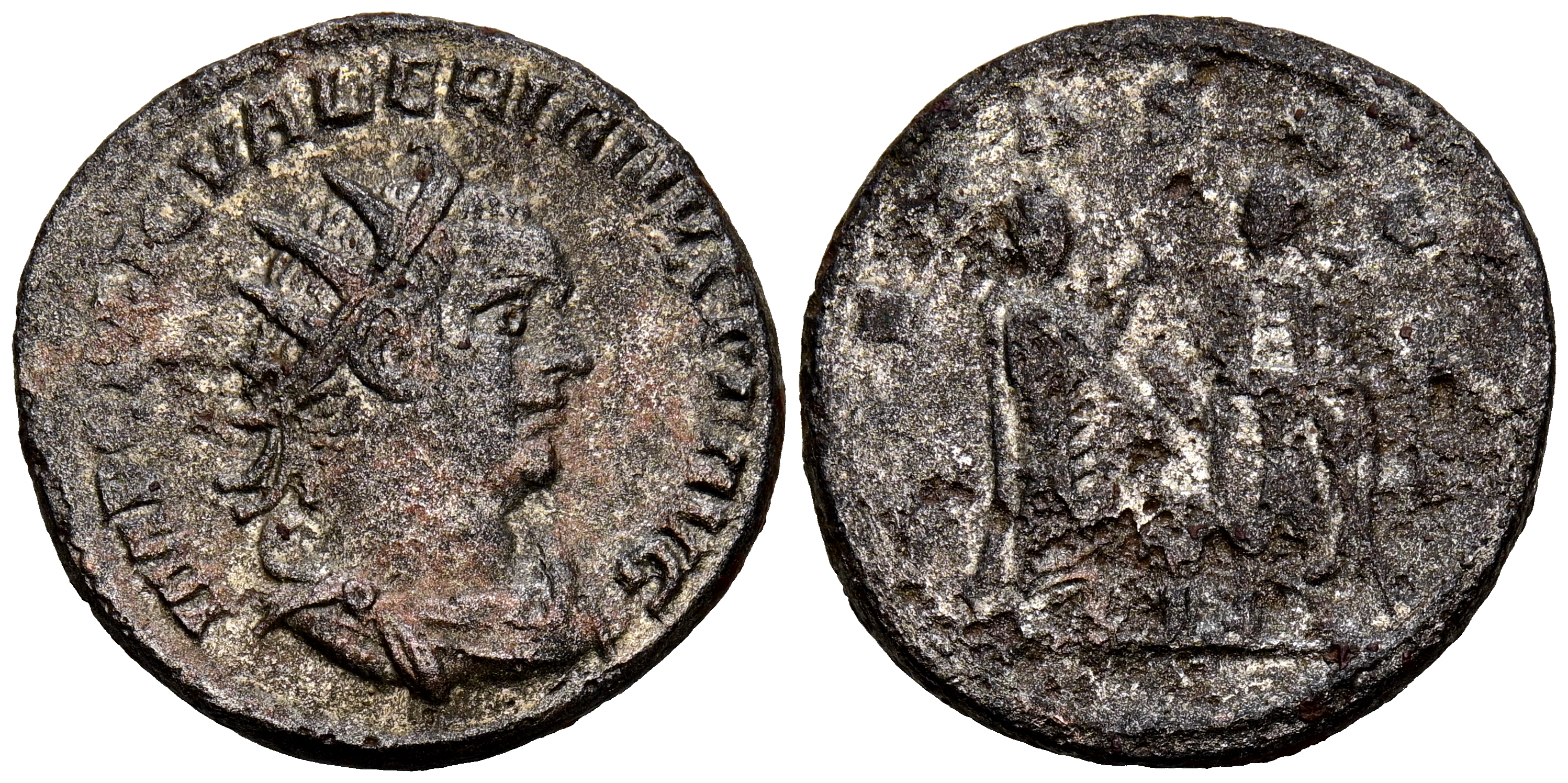 VALERIANO I. Antoniniano. (Ve. 3,93g/21mm). 256-260 d.C. Samosata. (RIC 285). Anv: Busto radiado y drapeado de Valeriano I a derecha, alrededor leyenda: IMP C P LIC VALERIANVS P F AVG. Rev: Valeriano I y Galieno enfrentados, entre ellos altar y ambos con cetros con águilas, alrededor leyenda: PIETAS AVGG. MBC/MBC-.